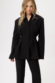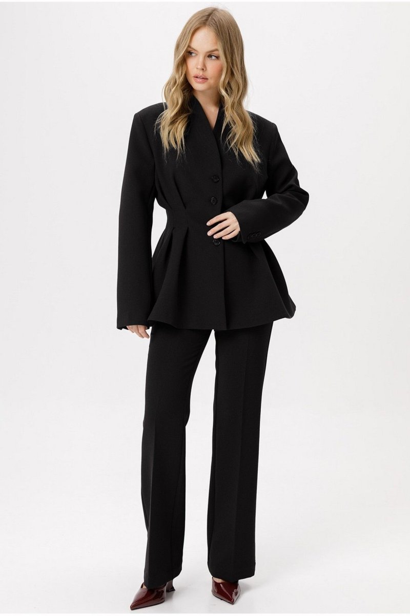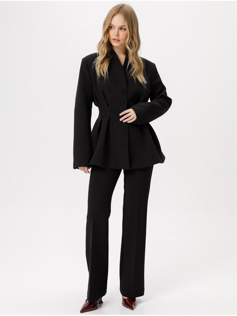 Костюм-двойка из приталенного жакета со складками и брюк-клеш со стрелками.