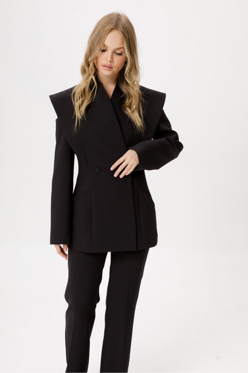 Детали: полуприлегающий силуэт, цельнокроеный воротник-стойка, двубортная застёжка на петли и пуговицы, рельефные швы переда и спинки с декоративным элементом, рукава длинные с вырезами по верху, функциональные карманы, жакет на подкладке. Брюки с притачным поясом со шлёвками, передние половинки с заутюженными стрелками, наклонные карманы, задние половинки с вытачками и заутюженными стрелками, застёжка на молнию и пуговицу с потайным крючком, пояс брюк прямой без резинки.