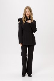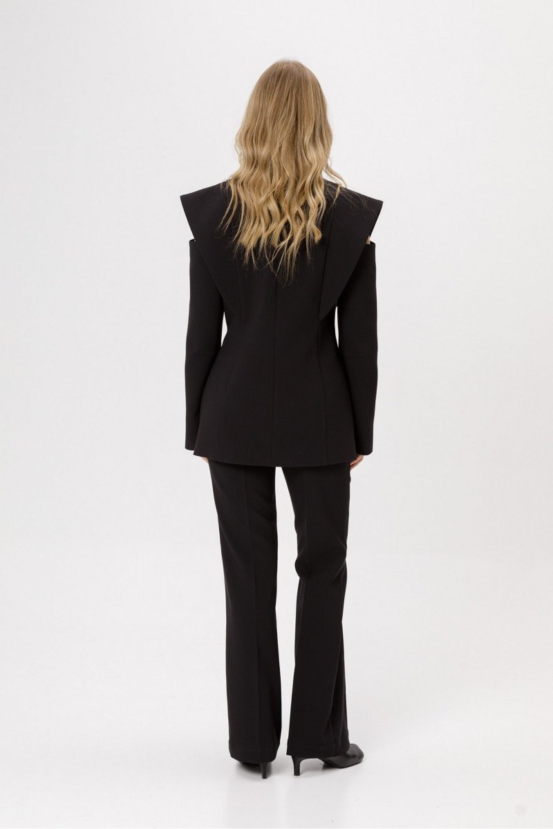 Костюм-двойка из приталенного двубортного жакета и облегающих брюк-клёш со стрелками.