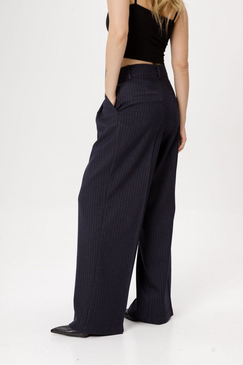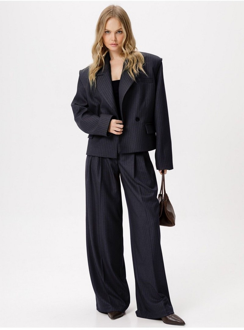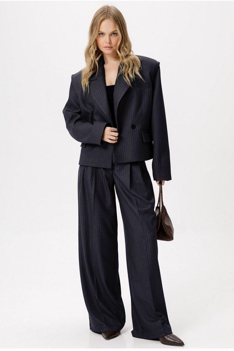 Костюм-двойка из укороченного оверсайз жакета с необработанным краем пройм и широких брюк-палаццо из текстильной ткани в полоску.