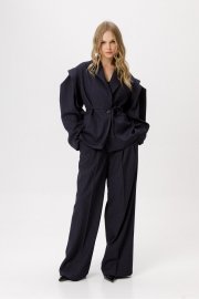 Детали: жакет прямого силуэта, удлинённая линия плеча, втачной одношовный рукав с ассиметричными складками, функциональные карманы, центральная застёжка на петлю и пуговицу, жакет на подкладке. Брюки с притачным поясом со шлевками, складки у пояса, застежка на молнию и пуговицу, боковые карманы, заутюженные стрелки. Задние части брюк с вытачками и имитацией карманов.