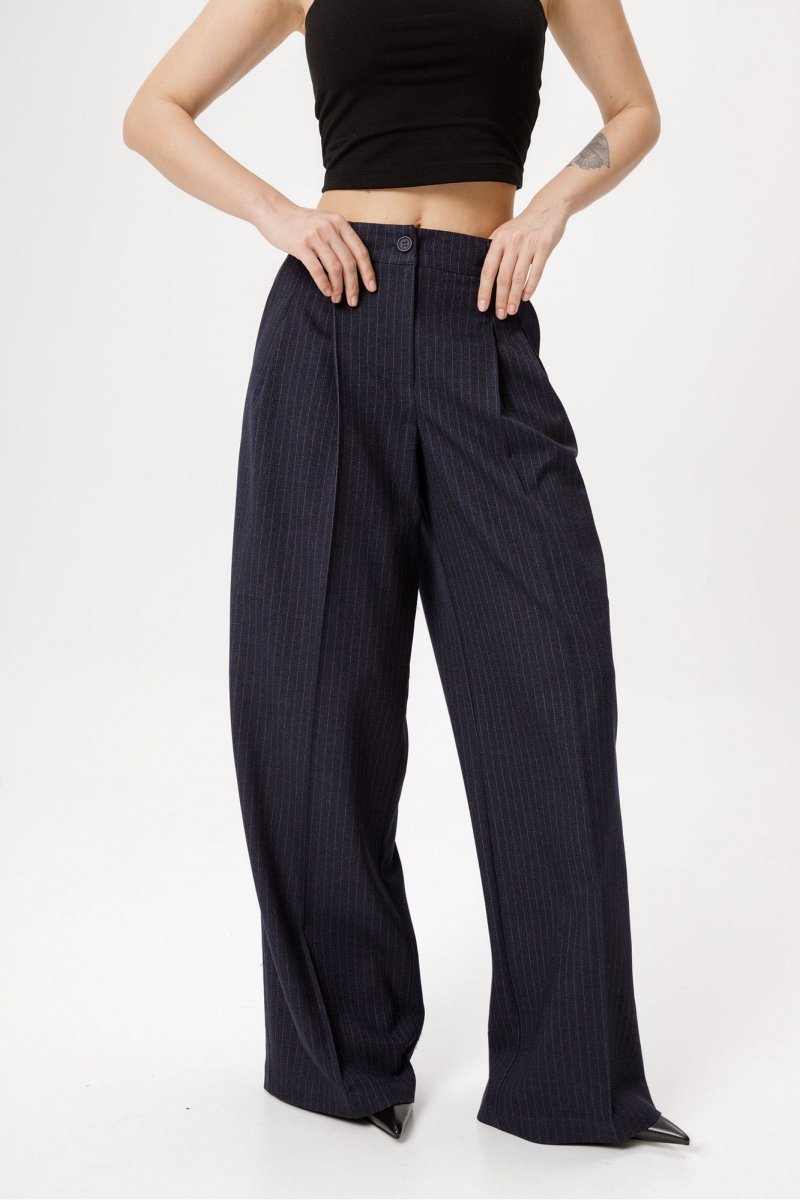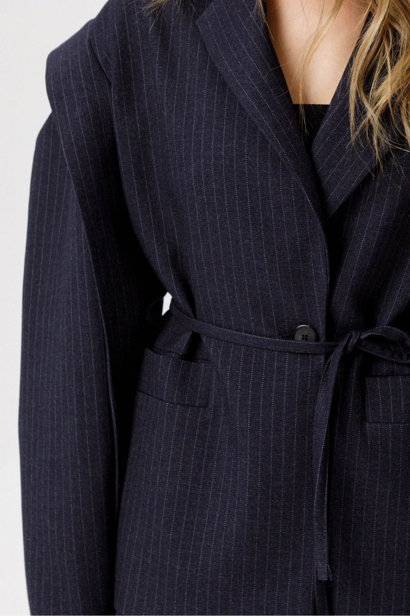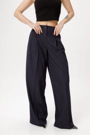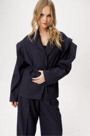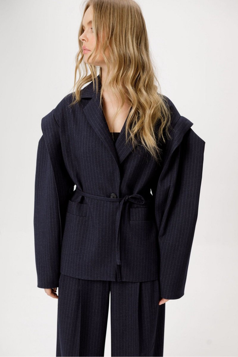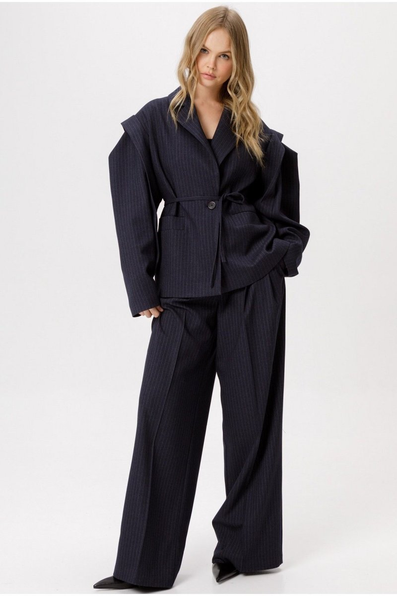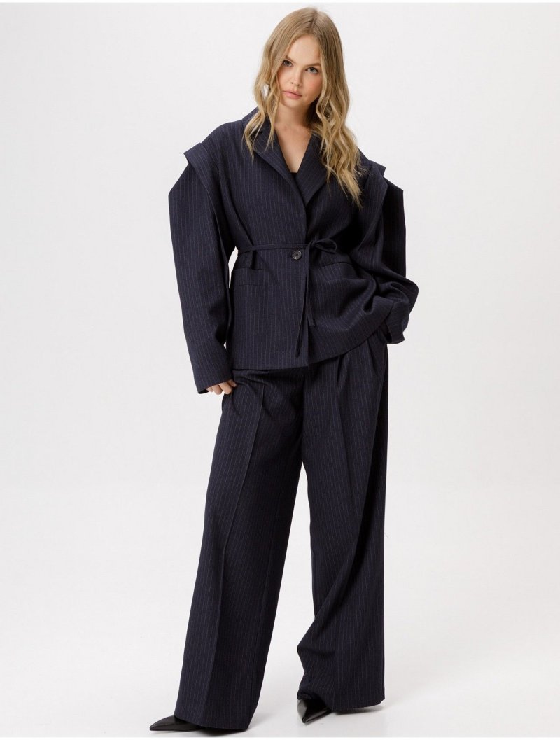 Костюм-двойка из оверсайз жакет со съёмным поясом и широких брюк-палаццо из текстильной ткани в полоску.