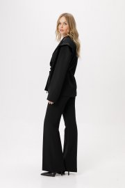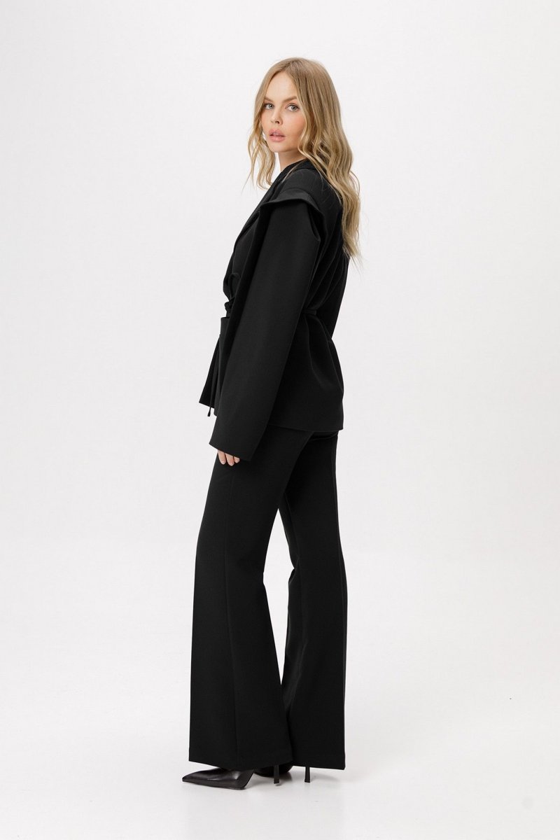 Детали: жакет прямого силуэта, удлинённая линия плеча, втачной одношовный рукав с ассиметричными складками, функциональные карманы, центральная застёжка на петлю и пуговицу, жакет на подкладке. Брюки с притачным поясом со шлёвками, передние половинки с заутюженными стрелками, наклонные карманы, задние половинки с вытачками и заутюженными стрелками, застёжка на молнию и пуговицу с потайным крючком, пояс брюк прямой без резинки.