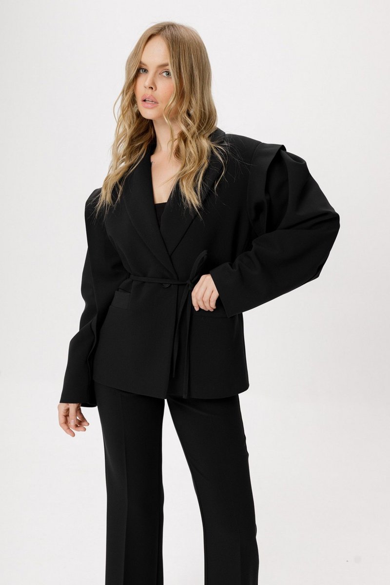 Костюм-двойка из оверсайз жакет со съёмным поясом и облегающих брюк-клёш со стрелками.