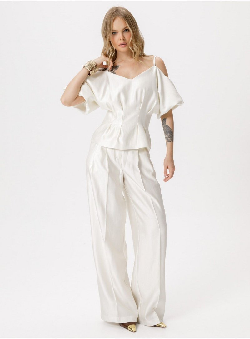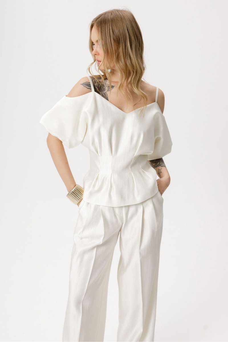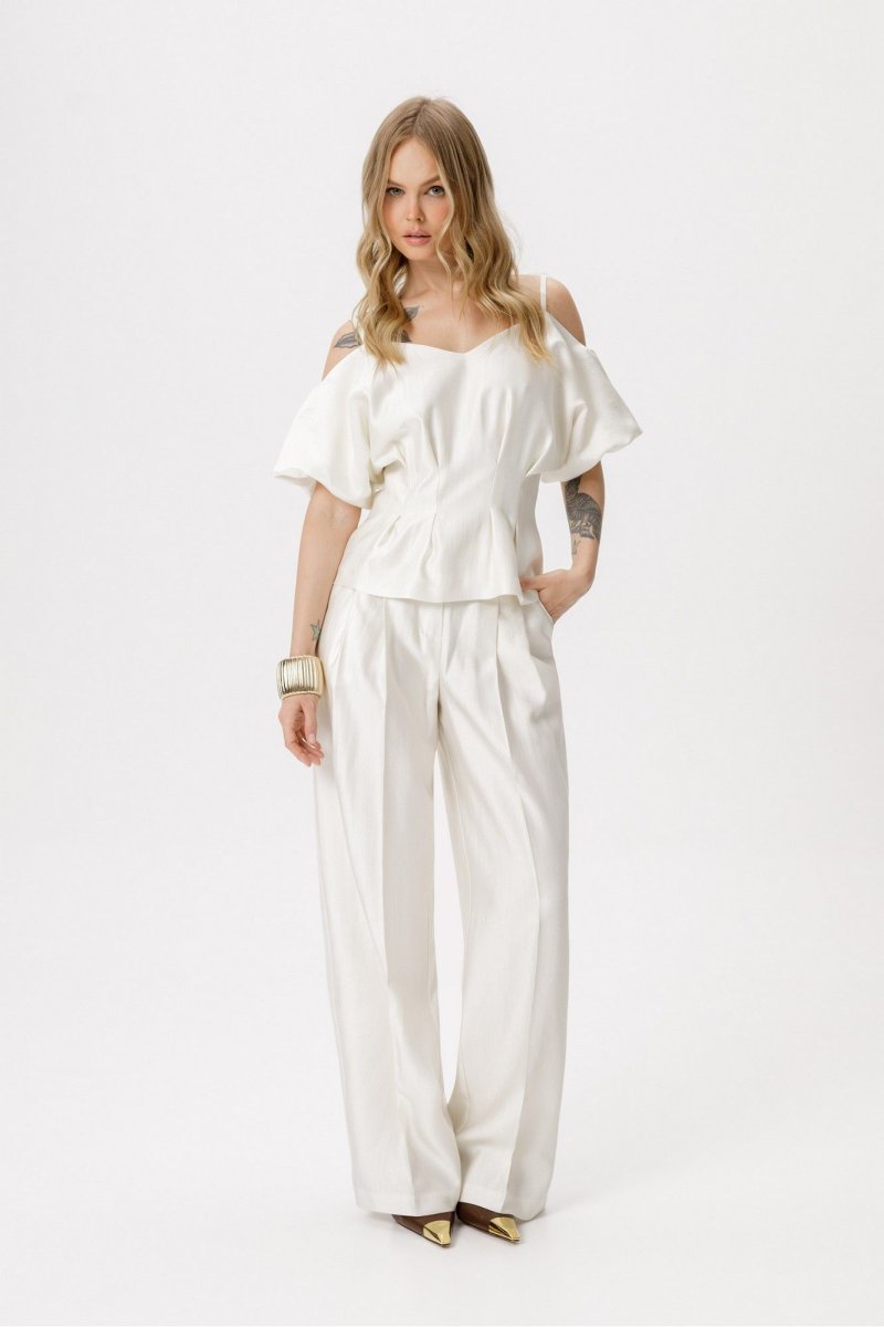 Костюм-двойка из приталенной блузы со складками и широких брюк-палаццо со стрелками.