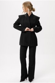 Детали: полуприлегающий силуэт, цельнокроеный воротник-стойка, двубортная застёжка на петли и пуговицы, рельефные швы переда и спинки с декоративным элементом, рукава длинные с вырезами по верху, функциональные карманы, жакет на подкладке. Брюки с притачным поясом со шлёвками, передние половинки с заутюженными стрелками, наклонные карманы, задние половинки с вытачками и заутюженными стрелками, застёжка на молнию и пуговицу с потайным крючком, пояс брюк прямой без резинки.