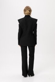 Костюм-двойка из приталенного двубортного жакета и облегающих брюк-клёш со стрелками.