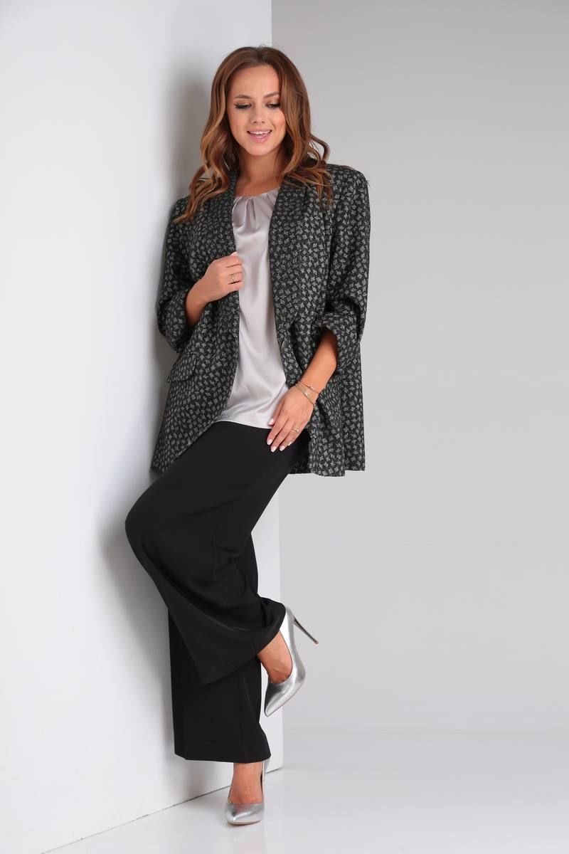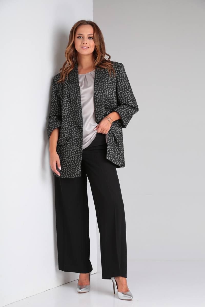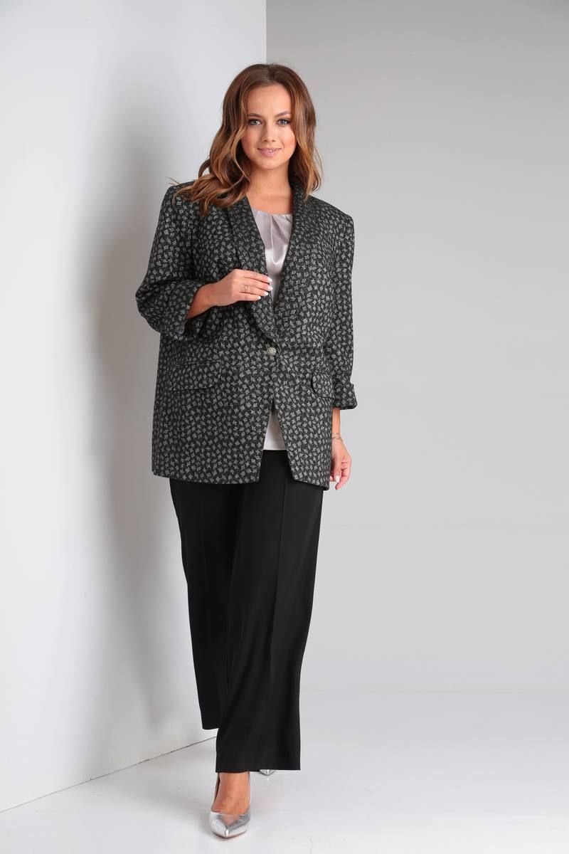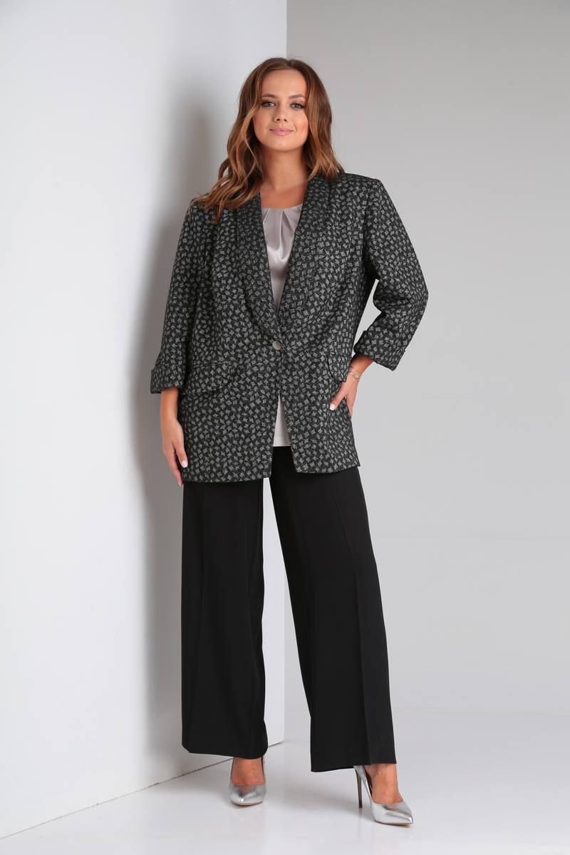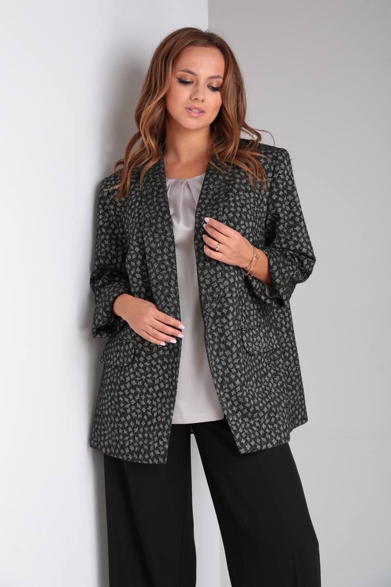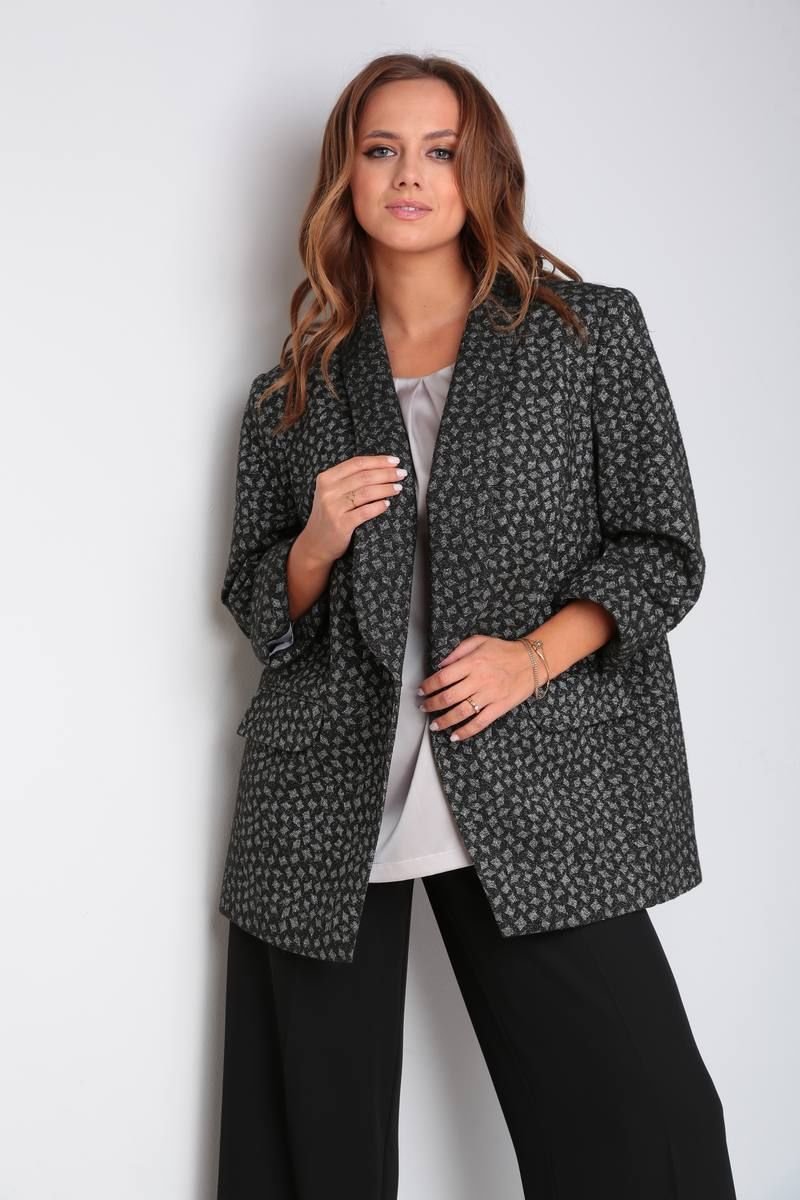 Жакет свободного покроя из трикотажного полотна с люрексом, на подкладке. По переду центральная застежка на одну пуговицу на уровне линии талии, функциональные карманы с клапаном, вертикальные рельефы от проймы. По спинке средний шов со шлицей от линии талии, вертикальные рельефы от проймы. Рукав втачной 2-х шовный 3/4 длины с манжетой. Воротник типа шаль на углубленной горловине.
