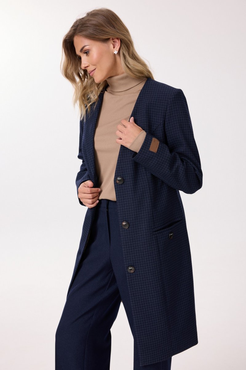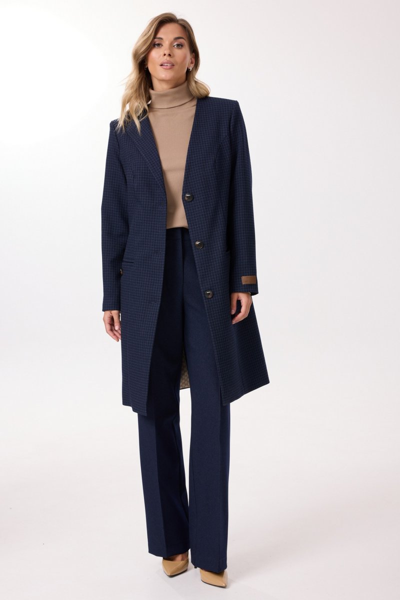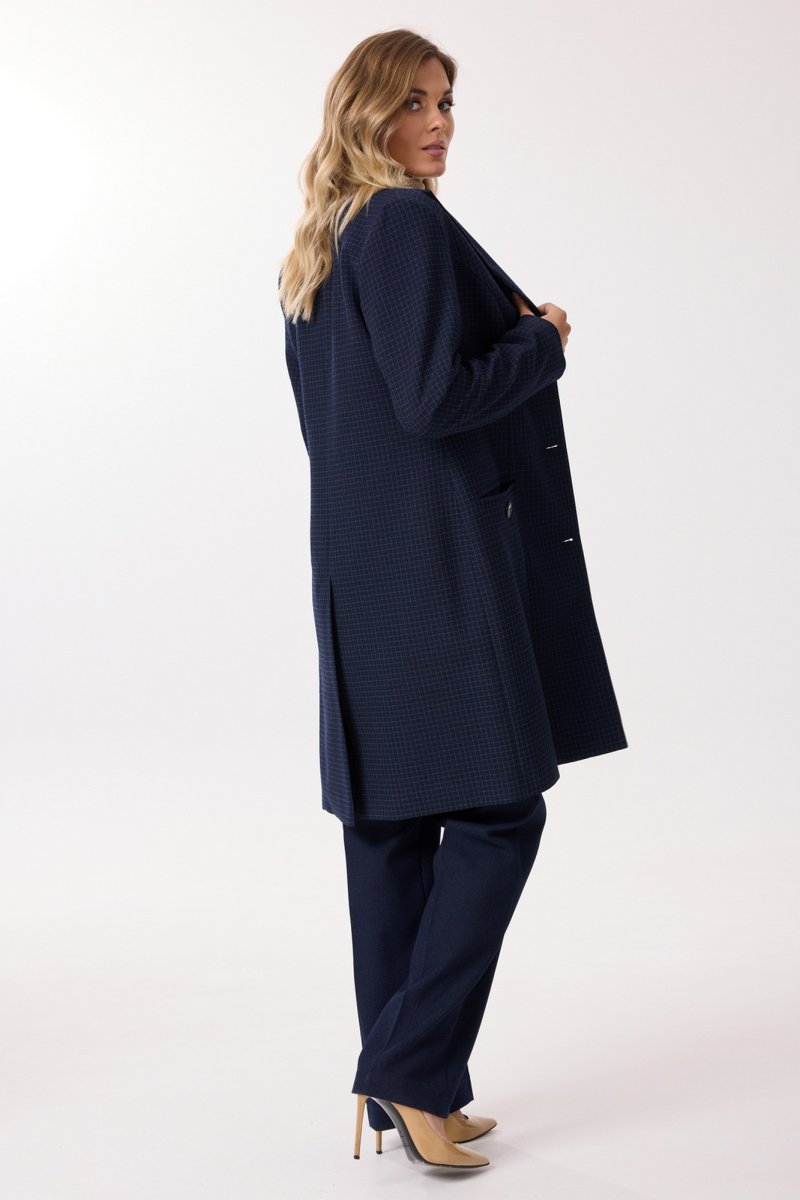 Комплект женский 3-х предметный, состоящий из жакета, брюк и джемпера. Жакет выполнен из поливискозы с принтом "мелкая клетка". Жакет удлиненный, полуприлегающего силуэта, на подкладке, с центральной застежкой на петли и пуговицы. Горловина жакета оформлена асимметрично, с одной стороны с лацканом. Рукава двухшовные длинные, на одном из которых расположена декоративная нашивка. Перед с рельефами, выходящими из проймы. В области бедер обработаны прорезные карманы "в рамку", которые украшены декоративной пуговицей. Спинка со средним швом и шлицей по низу. Брюки прямого силуэта со стрелками по передним и задним половинкам. Выполнены из однотонной поливискозы. Верхний срез обработан притачным поясом. По центру переда - застёжка на крючок и тесьму-молнию. На задних половинках расположены талиевые вытачки и декоративные листочки. В боковых швах расположены наклонные карманы. Джемпер прямого силуэта, выполнен из вискозы. Перед и спинка цельнокроенная. Рукав длинный. Горловина типа "водолазка". Длина изделия - середина бедра.