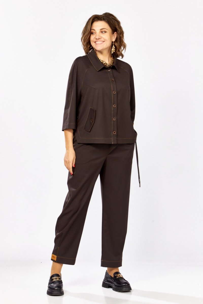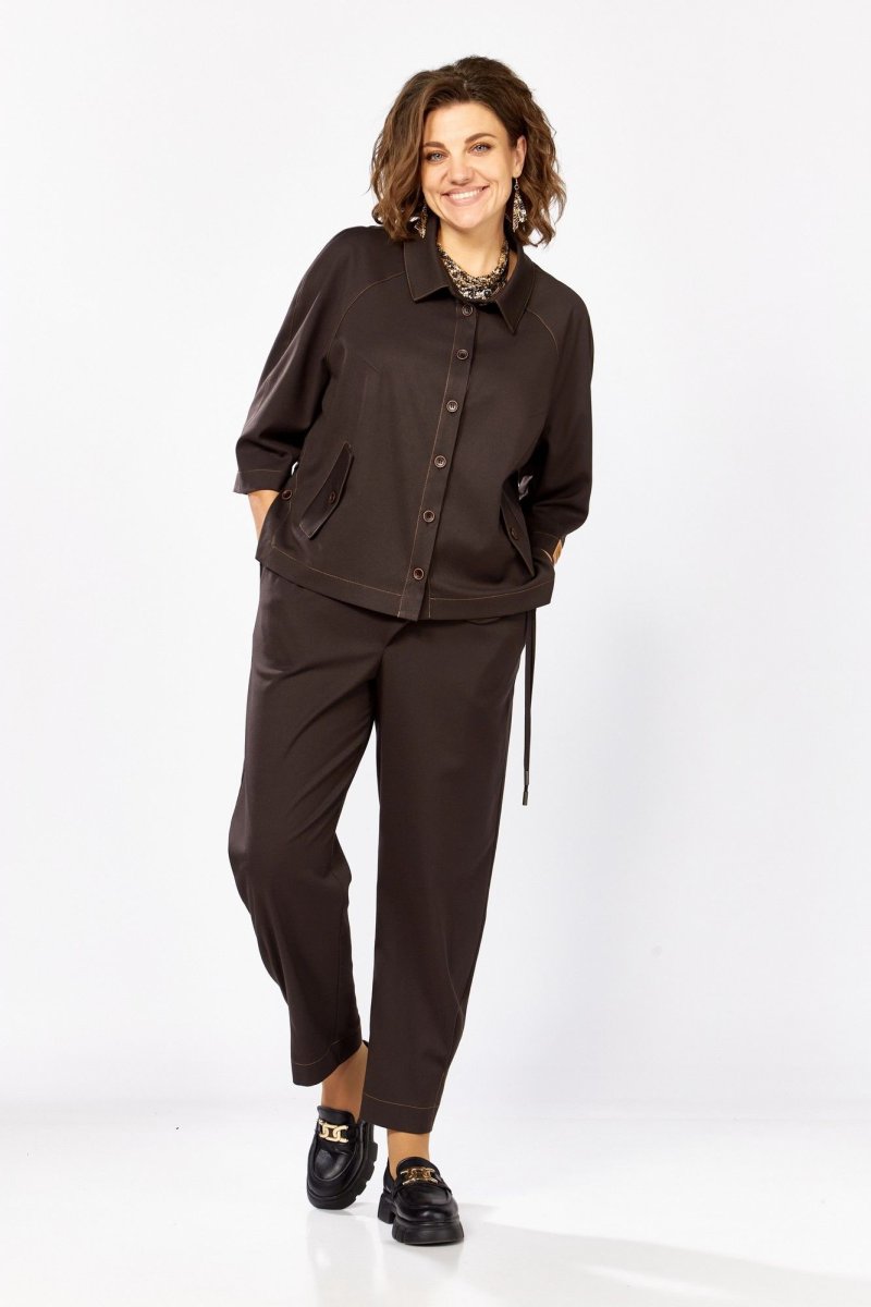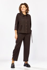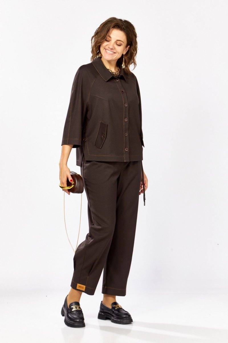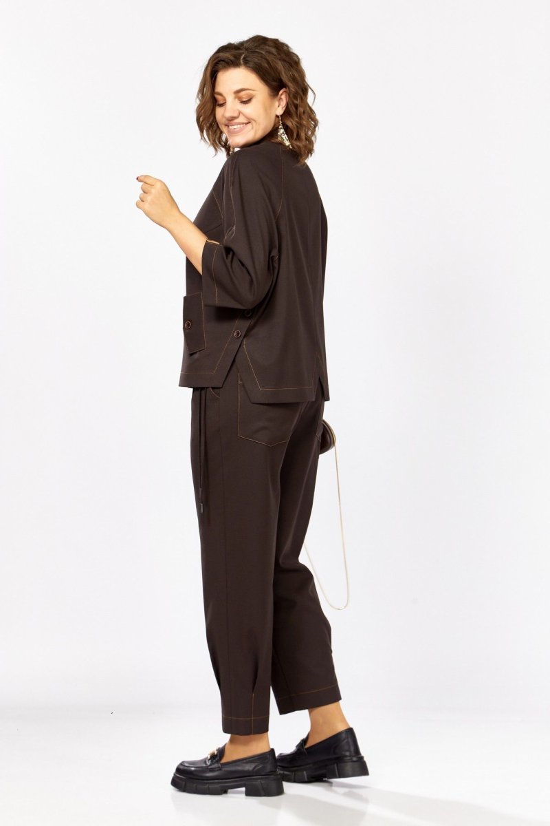 Стильный костюм выполнен из поливискозной костюмной ткани цвета горького шоколада и отстрочен контрастной отделочной строчкой. Свободный крой подарит уверенность и комфорт, а сбалансированные пропорции выгодно подчеркнут вашу фигуру. Жакет прямого силуэта, воротник рубашечный, рукав реглан, спинка со средним швом. Низ спинки фигурной формы, на полочках обработаны карманы с клапаном. В боковых швах жакета обработаны шлицы, которые декорированы пуговицами. Застежка центральная, на петли пуговицы. Брюки прямые, зауженные к низу за счет складок, которые отстрочены контрастной отделочной строчкой. Перед брюк с карманами. Застежка на тесьму-молнию, которая закрыта ассиметричной складкой с завязкой. Задние половинки брюк с накладными карманами. Пояс брюк цельнокроеный, сзади на резинке. Завязки декорированы металлическими наконечниками. Костюм декорирован нашивками, расположенными по низу брюк и низу рукава.