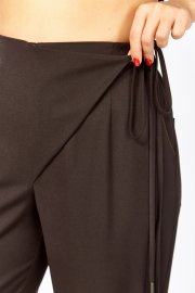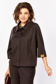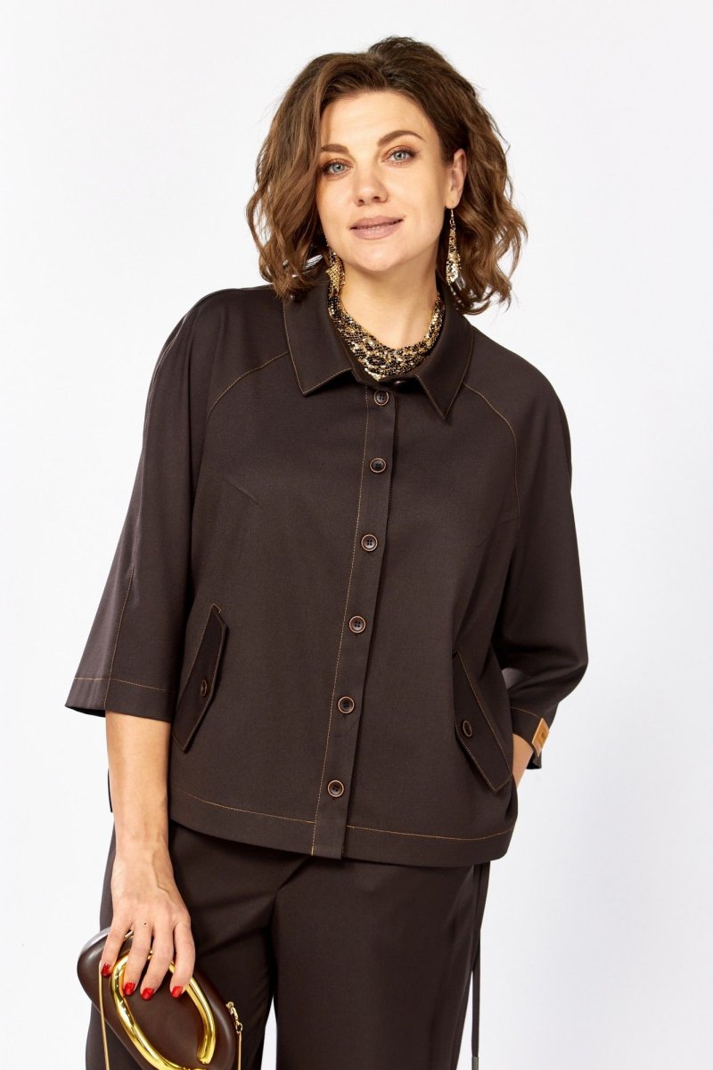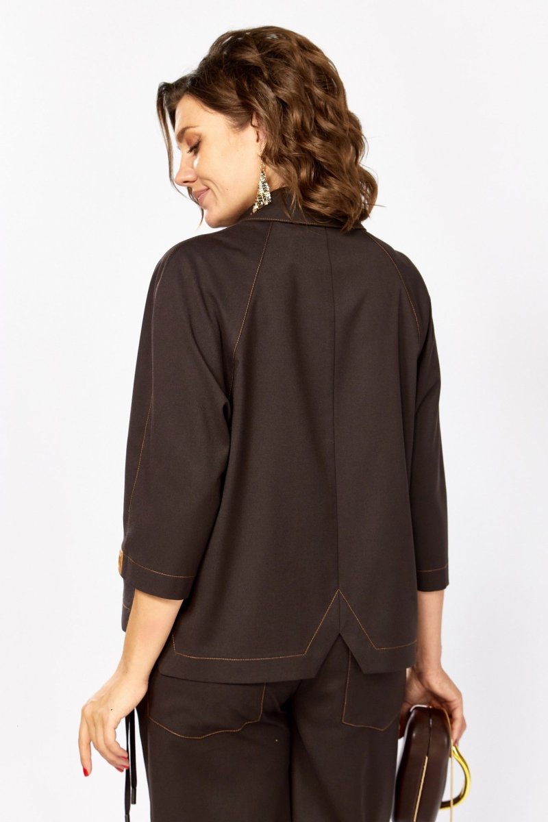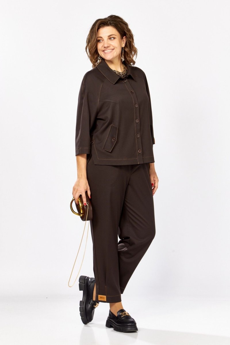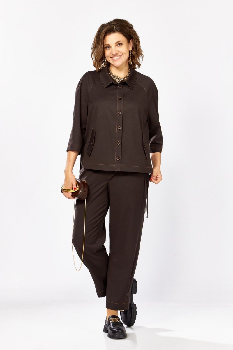 Стильный костюм выполнен из поливискозной костюмной ткани цвета горького шоколада и отстрочен контрастной отделочной строчкой. Свободный крой подарит уверенность и комфорт, а сбалансированные пропорции выгодно подчеркнут вашу фигуру. Жакет прямого силуэта, воротник рубашечный, рукав реглан, спинка со средним швом. Низ спинки фигурной формы, на полочках обработаны карманы с клапаном. В боковых швах жакета обработаны шлицы, которые декорированы пуговицами. Застежка центральная, на петли пуговицы. Брюки прямые, зауженные к низу за счет складок, которые отстрочены контрастной отделочной строчкой. Перед брюк с карманами. Застежка на тесьму-молнию, которая закрыта ассиметричной складкой с завязкой. Задние половинки брюк с накладными карманами. Пояс брюк цельнокроеный, сзади на резинке. Завязки декорированы металлическими наконечниками. Костюм декорирован нашивками, расположенными по низу брюк и низу рукава.
