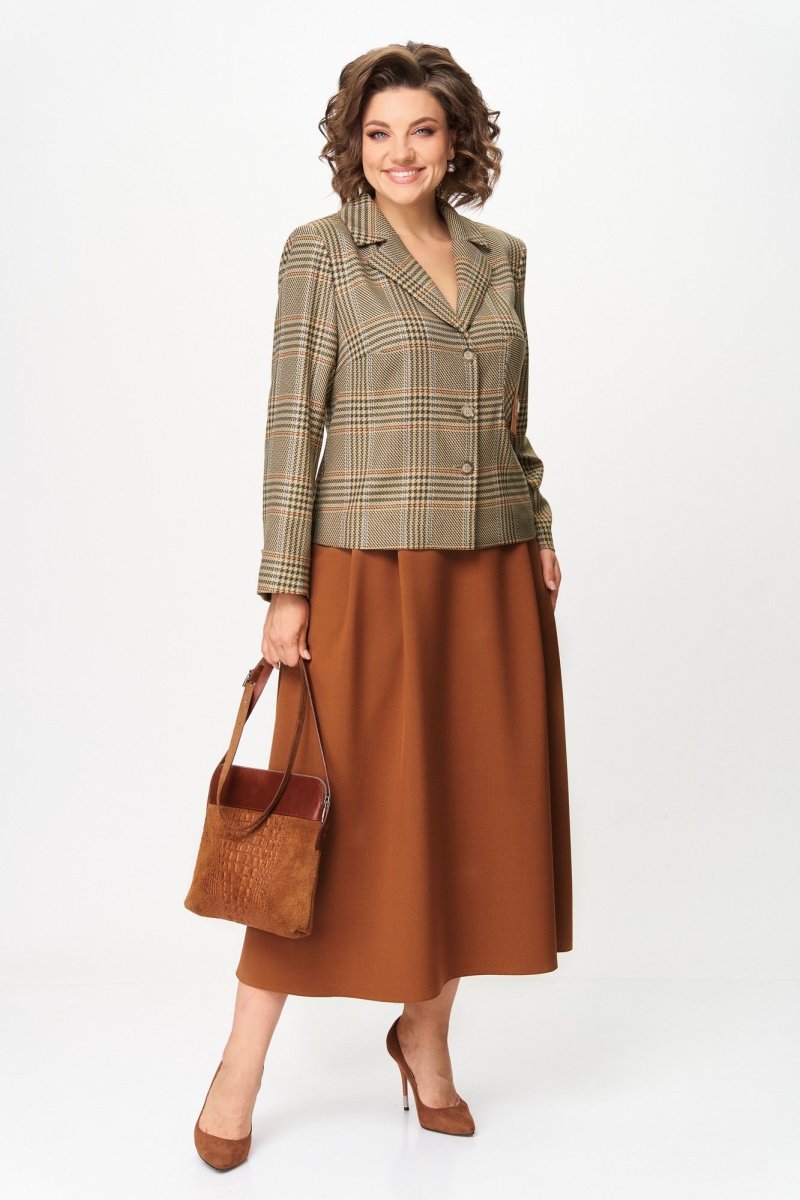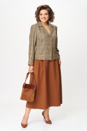 Комплект женский состоит из жакета и юбки. Элегантный женский жакет без подкладки с воротником пиджачного типа и застежкой на 3-и петли и пуговицы. По левой части переда накладной карман с декоративной нашивкой. Рукав втачной двухшовный со шлицей по низу и петлями с пуговицами. Юбка А-образного силуэта со складками по переду, в боковых швах карманы. Юбка на подкладке. Для максимально комфортной посадки по бокам пояса вставлена эластичная резинка. Длина жакета 49 см, длина рукава 60 см, длина юбки 85 см.