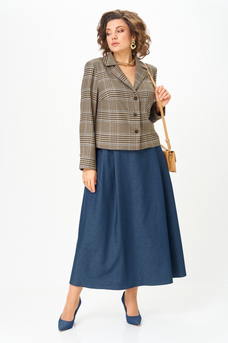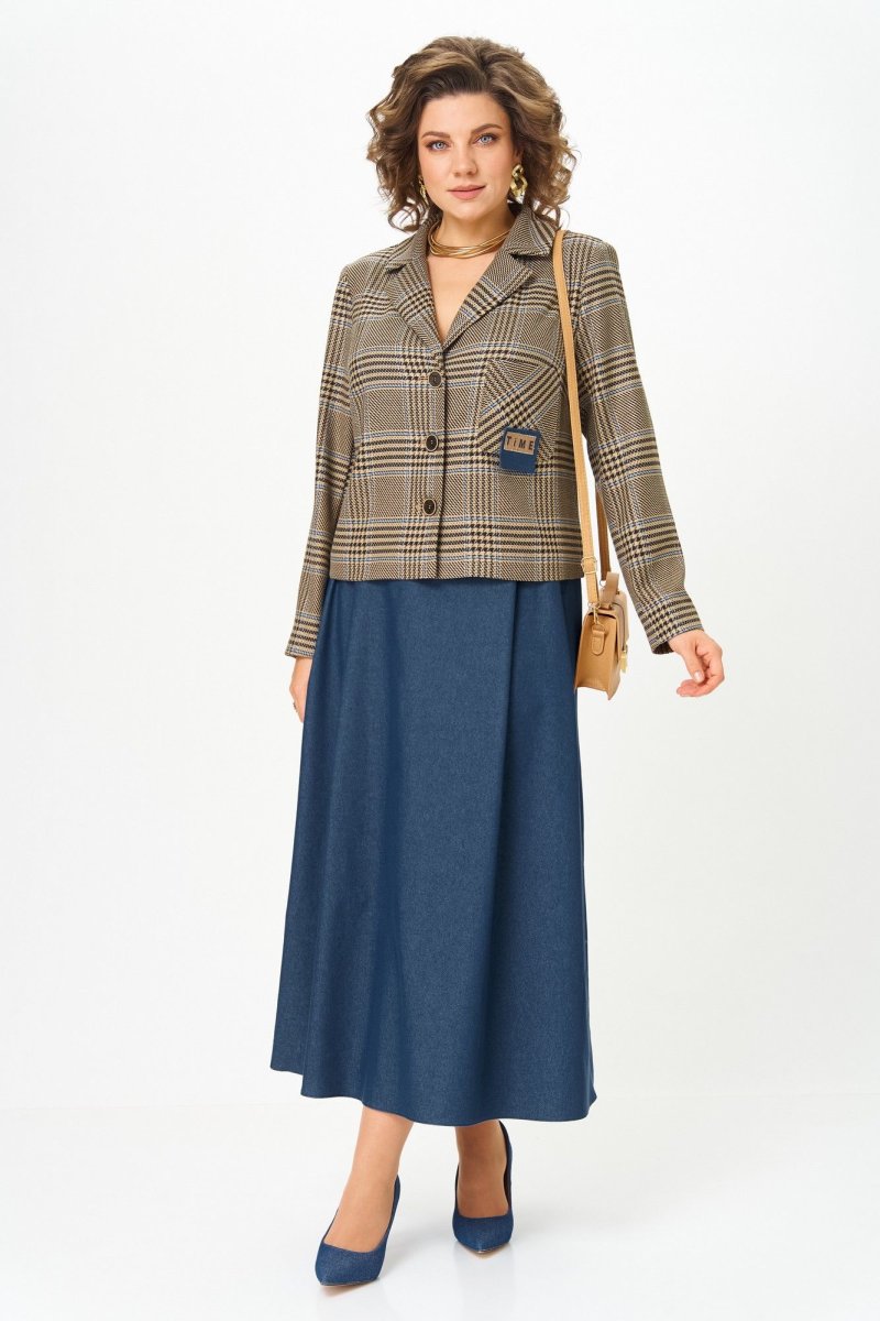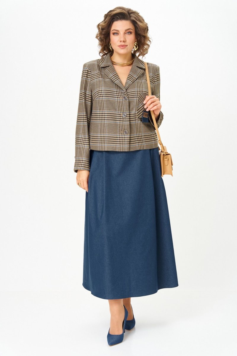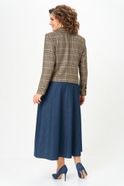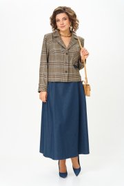 Комплект женский состоит из жакета и юбки. Элегантный женский жакет без подкладки с воротником пиджачного типа и застежкой на 3-и петли и пуговицы. По левой части переда накладной карман с декоративной нашивкой. Рукав втачной двухшовный со шлицей по низу и петлями с пуговицами. Юбка А-образного силуэта со складками по переду, в боковых швах карманы. Юбка на подкладке. Для максимально комфортной посадки по бокам пояса вставлена эластичная резинка. Длина жакета 49 см, длина рукава 60 см, длина юбки 85 см.