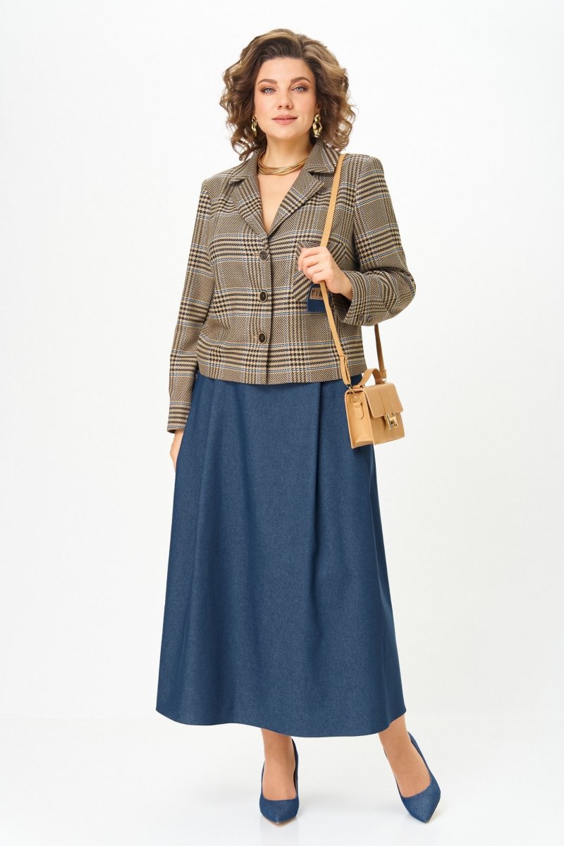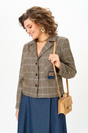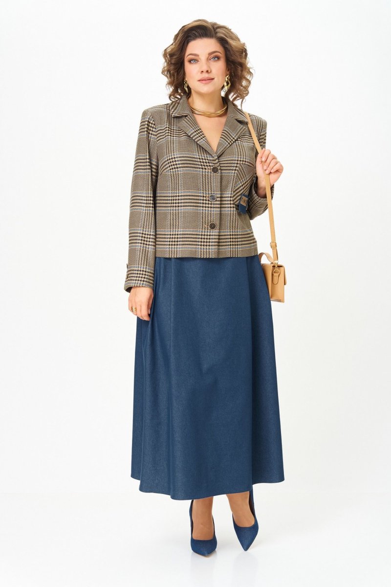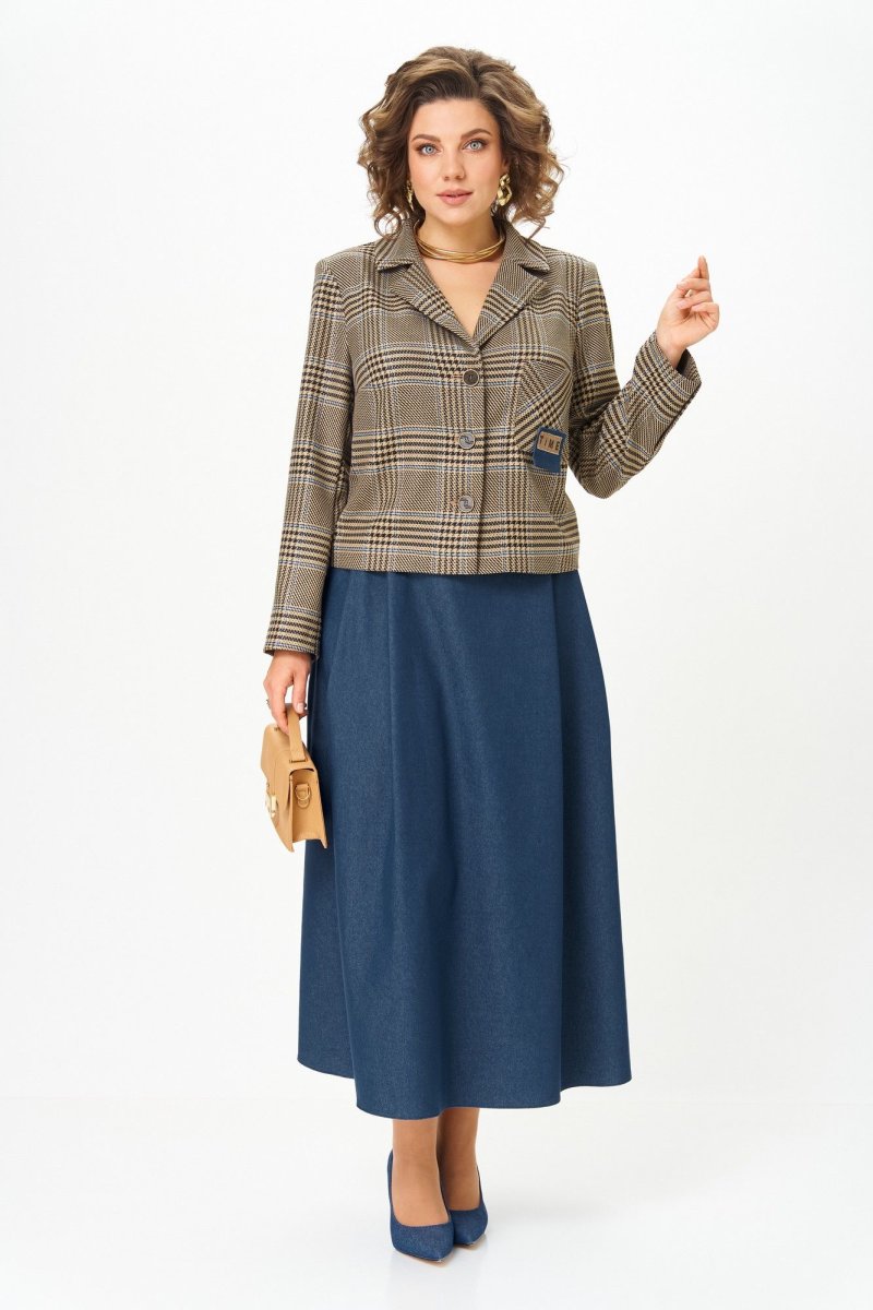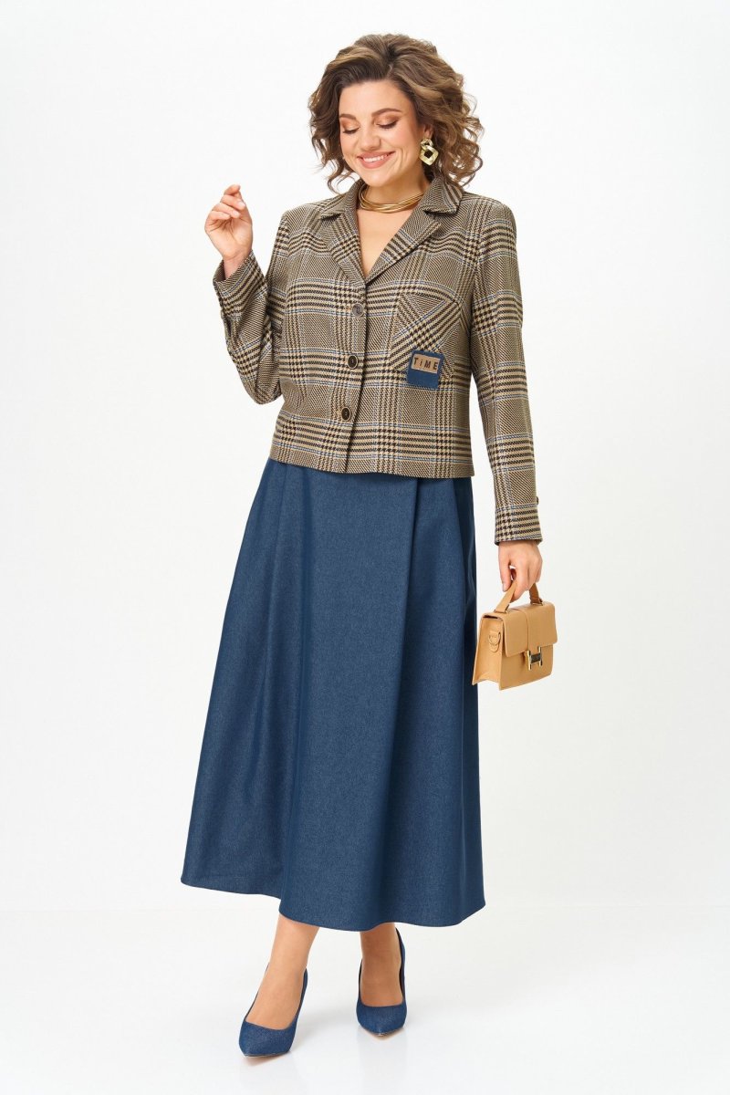 Комплект женский состоит из жакета и юбки. Элегантный женский жакет без подкладки с воротником пиджачного типа и застежкой на 3-и петли и пуговицы. По левой части переда накладной карман с декоративной нашивкой. Рукав втачной двухшовный со шлицей по низу и петлями с пуговицами. Юбка А-образного силуэта со складками по переду, в боковых швах карманы. Юбка на подкладке. Для максимально комфортной посадки по бокам пояса вставлена эластичная резинка. Длина жакета 49 см, длина рукава 60 см, длина юбки 85 см.