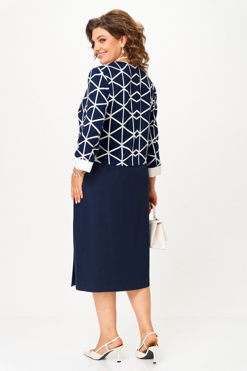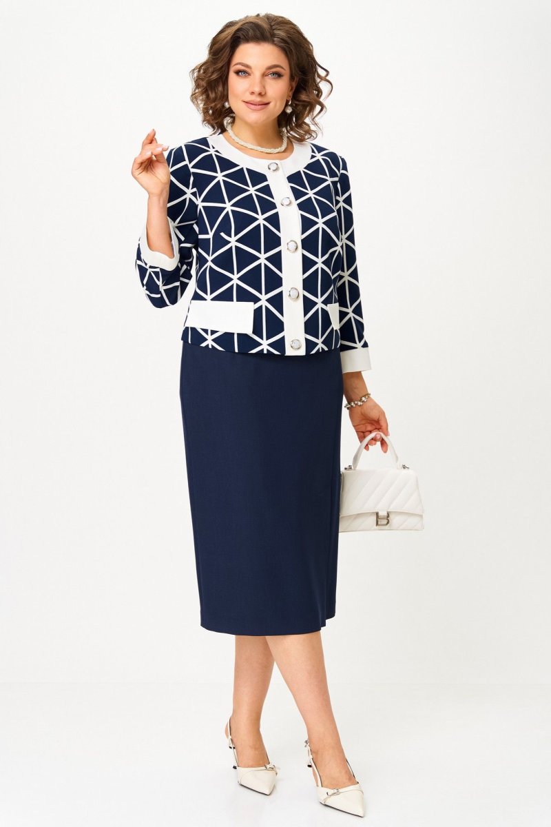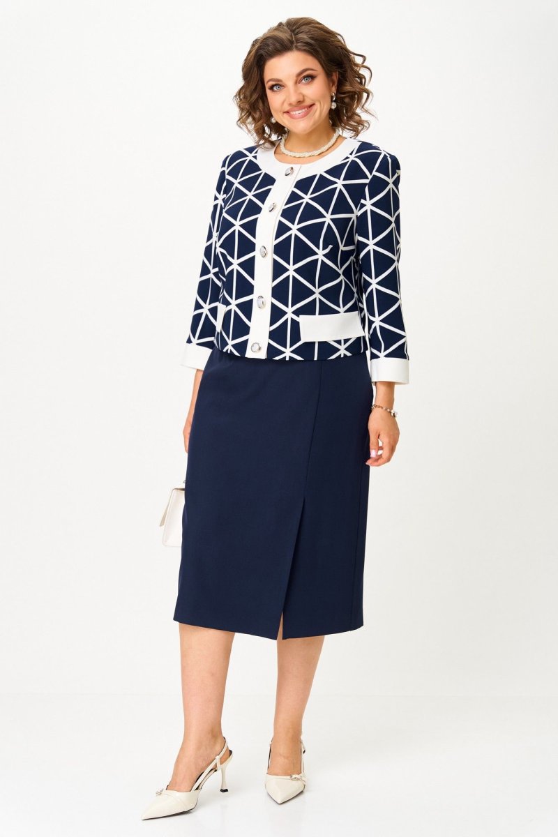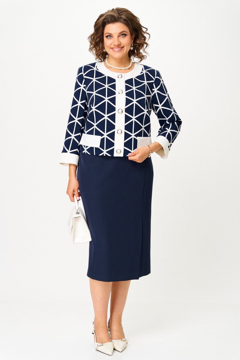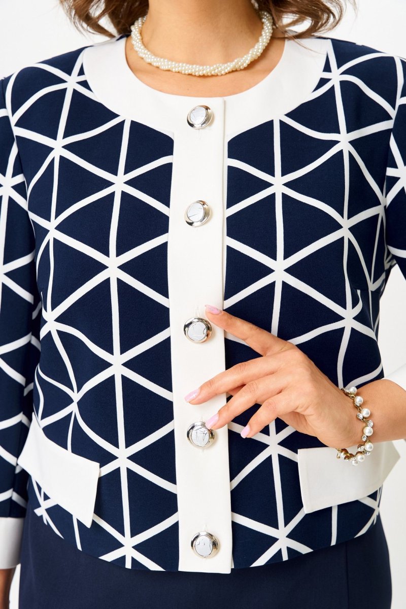 Комплект двух-предметный, состоящий из жакета и юбки. Жакет с декоративной контрастной отделкой, прямого силуэта с центральной застёжкой на петли и пуговицы, горловина округлой формы. По переду жакета нагрудные вытачки и декоративные клапаны. Спинка жакета со средним швом Рукав втачной, двухшовный с манжетой по низу. Жакет на подкладке по переду. Юбка прямого силуэта со шлицей спереди по левой части. Пояс притачной с эластичной тесьмой по спинке, что обеспечивает максимально комфортную посадку на любой тип фигуры. Длина жукета 54см, длина рукава 52см. Длина юбки 77см.