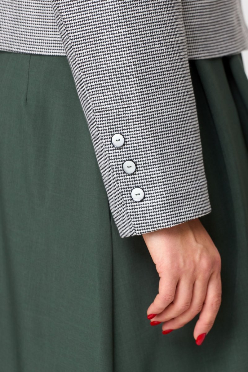 Комплект женский состоит из жакета и юбки. Элегантный женский жакет без подкладки с воротником пиджачного типа и застежкой на 3-и петли и пуговицы. По левой части переда накладной карман с декоративной нашивкой. Рукав втачной двухшовный со шлицей по низу и петлями с пуговицами. Юбка А-образного силуэта со складками по переду, в боковых швах карманы. Юбка на подкладке. Для максимально комфортной посадки по бокам пояса вставлена эластичная резинка. Длина жакета 50 см, длина рукава 60 см, длина юбки 85 см.