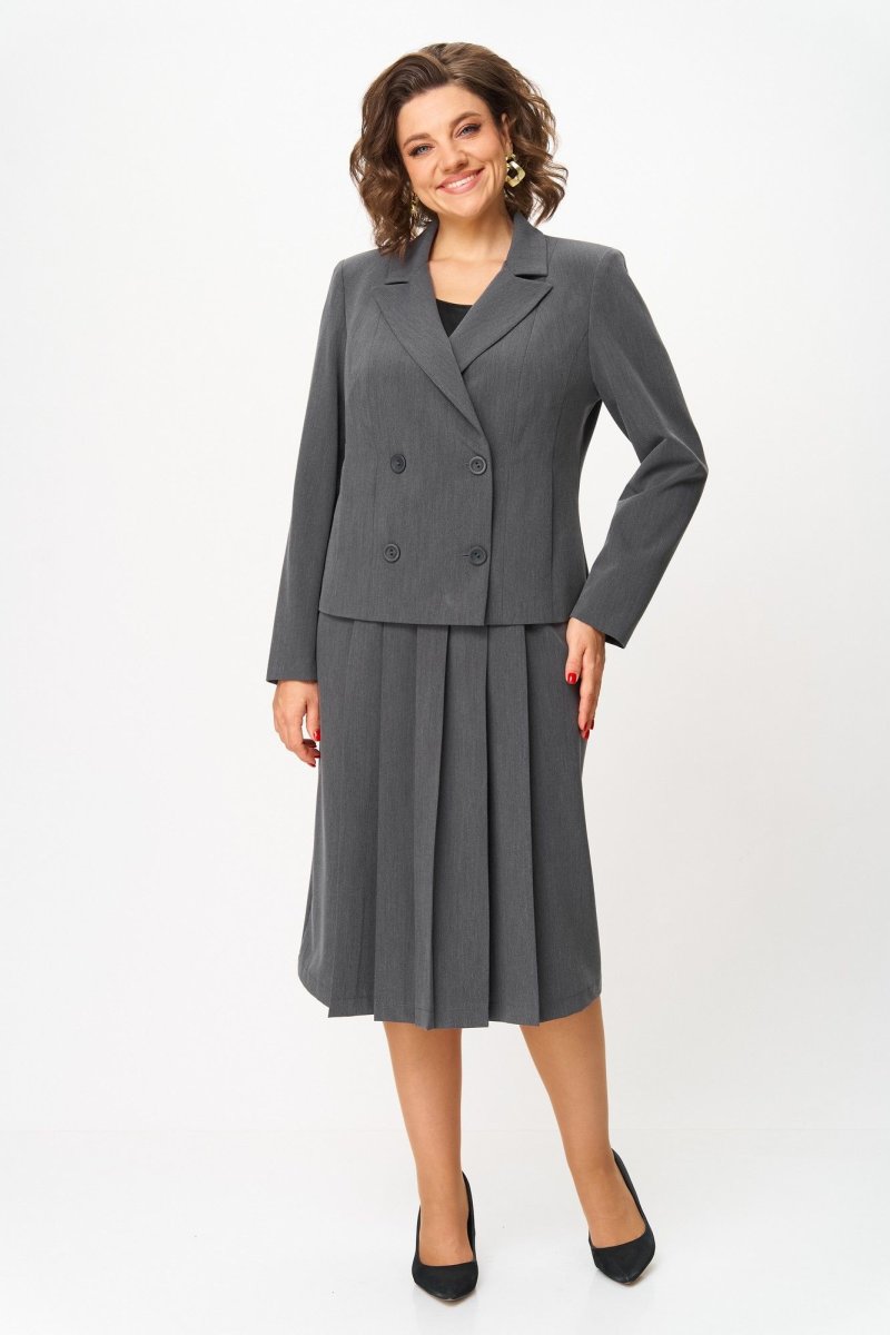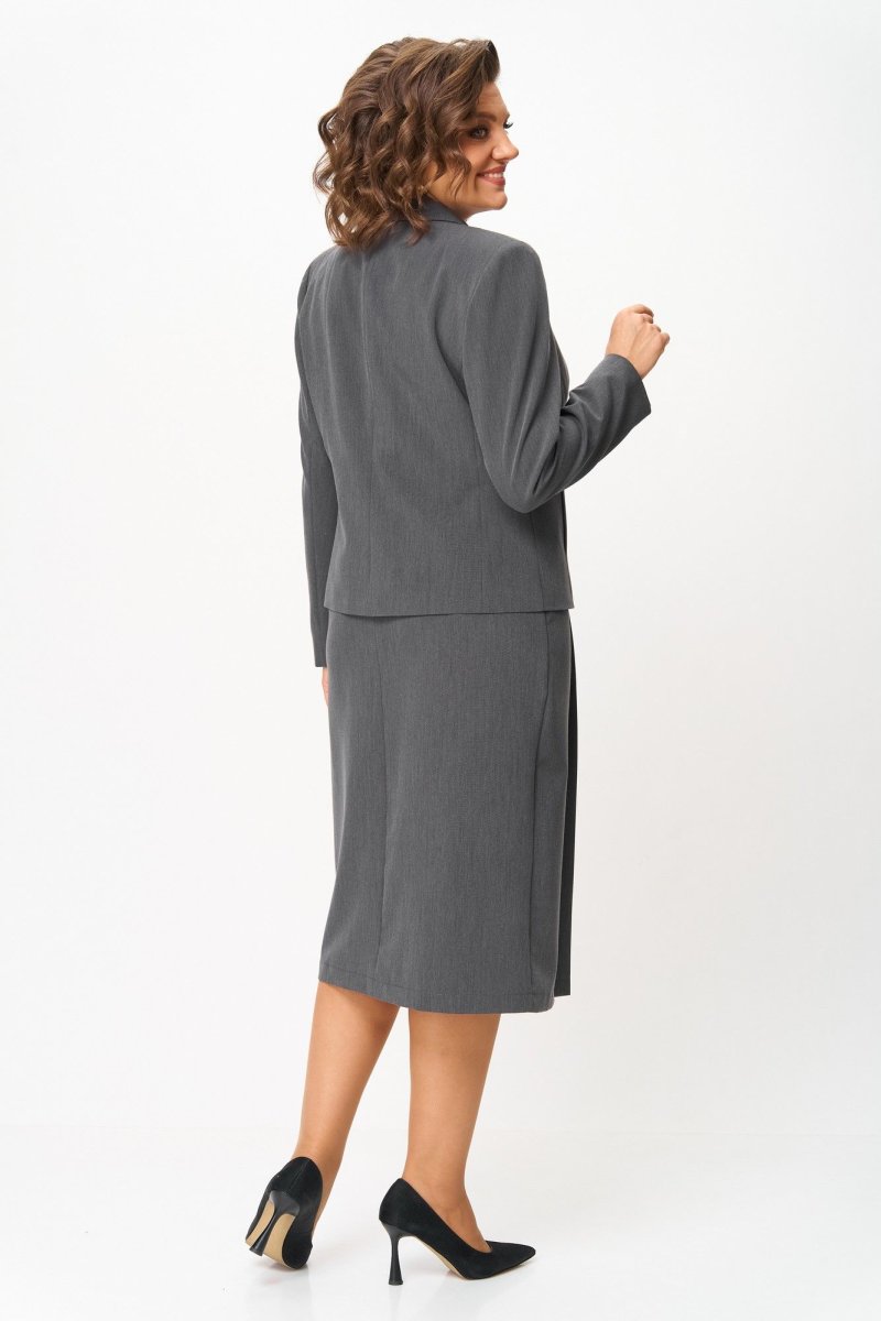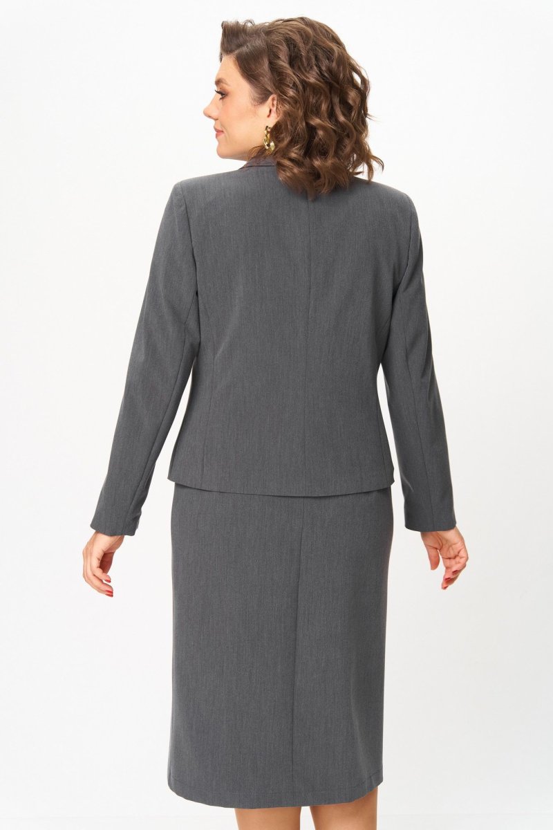 Костюм состоит из жакета и юбки. Костюм выполнен из однотонной ткани. Жакет прямого силуэта, на подкладке.