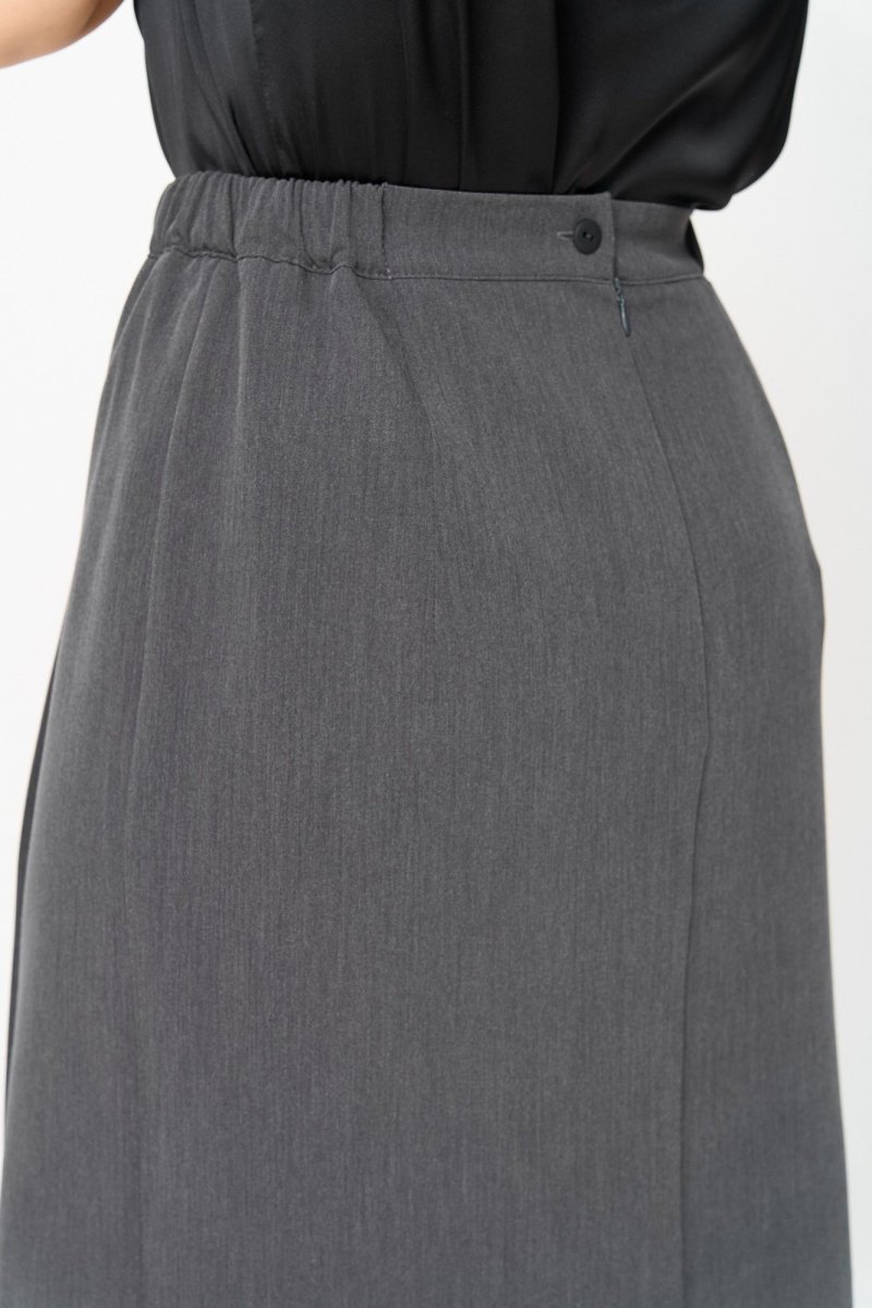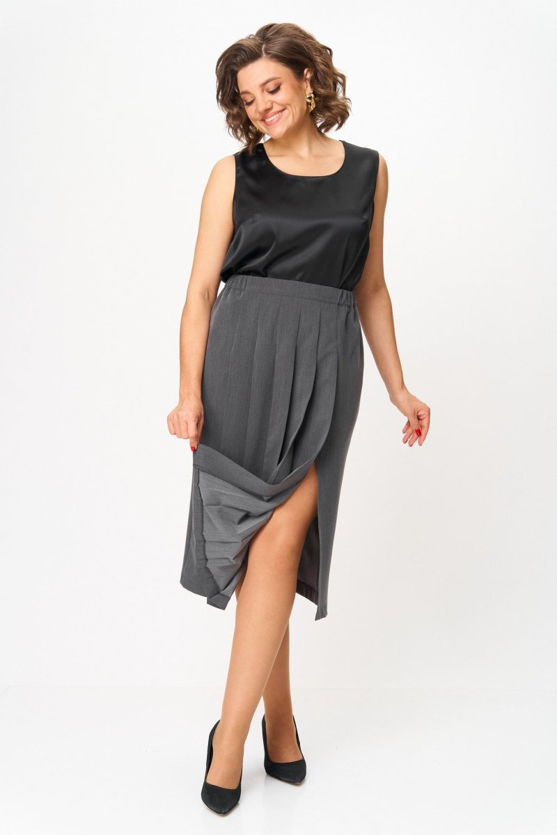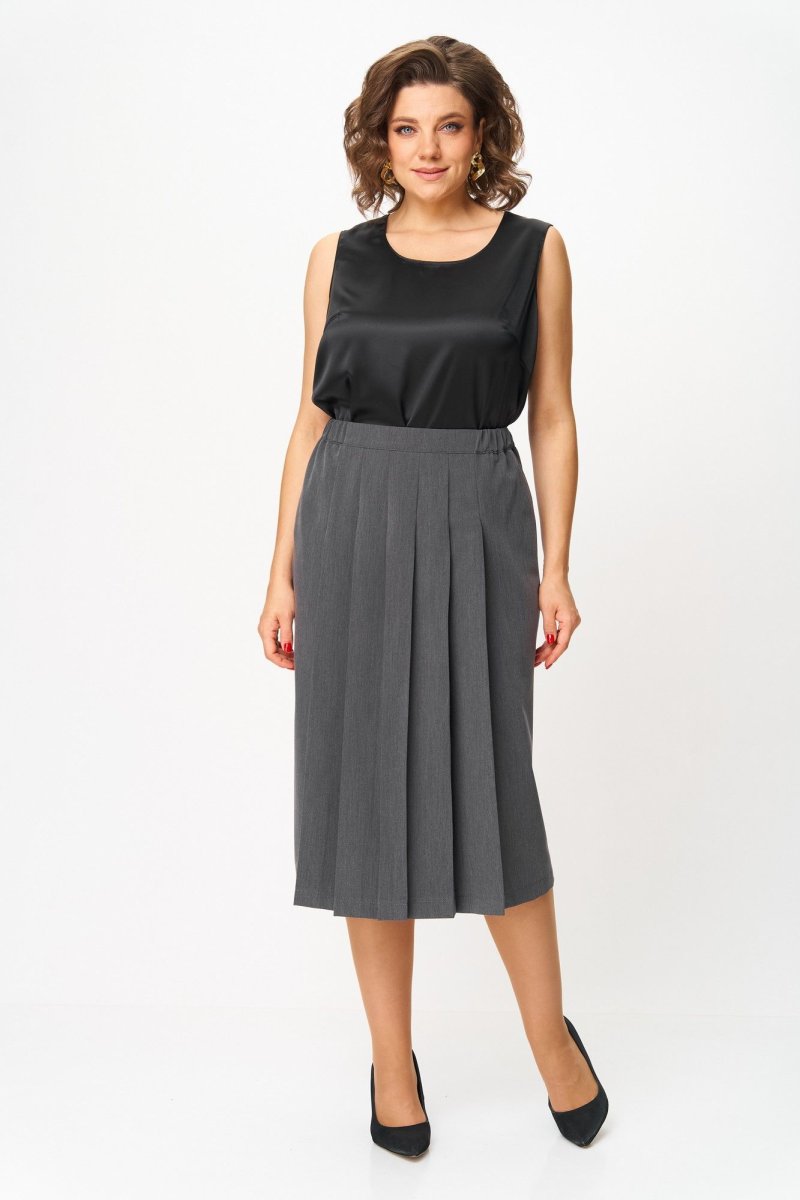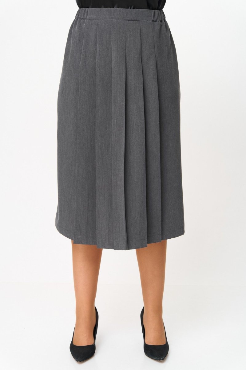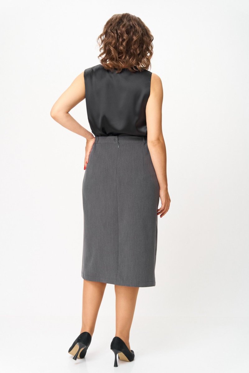 Юбка длиной миди, прямого силуэта. Передняя часть юбки по центру со складками и потайным разрезом с левой стороны. Задняя часть юбки с талиевыми вытачками. По талии юбка на притачном поясе, пояс с эластичной тесьмой и застежкой на петлю и пуговицу.