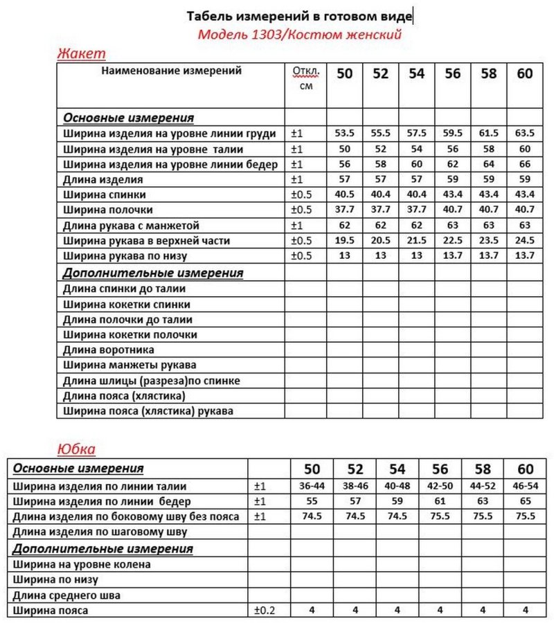 Таблица размеров
