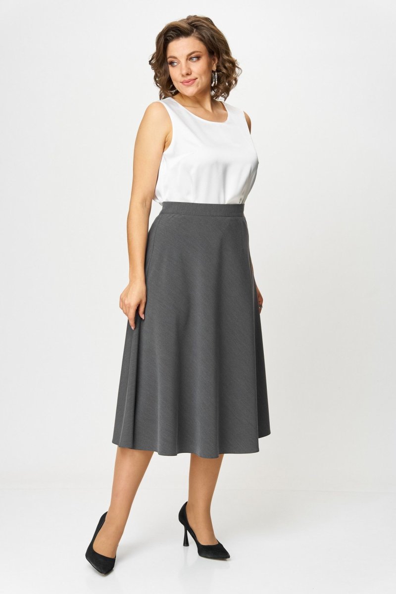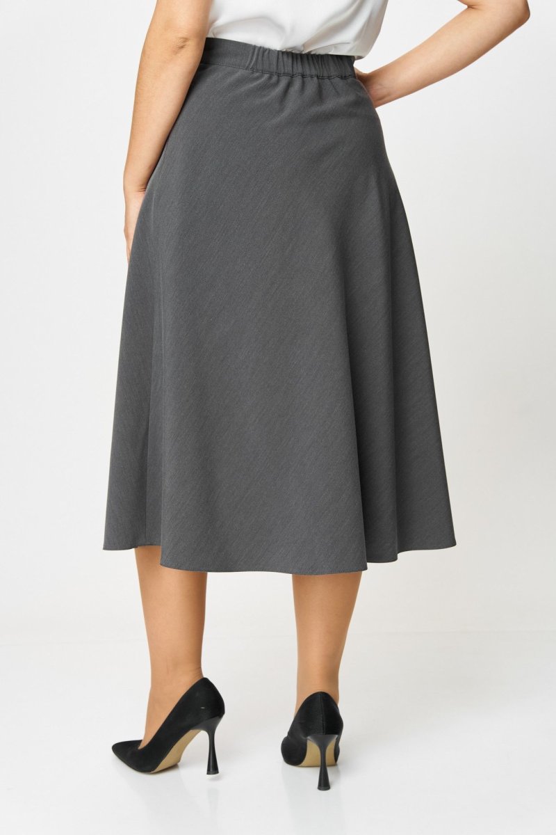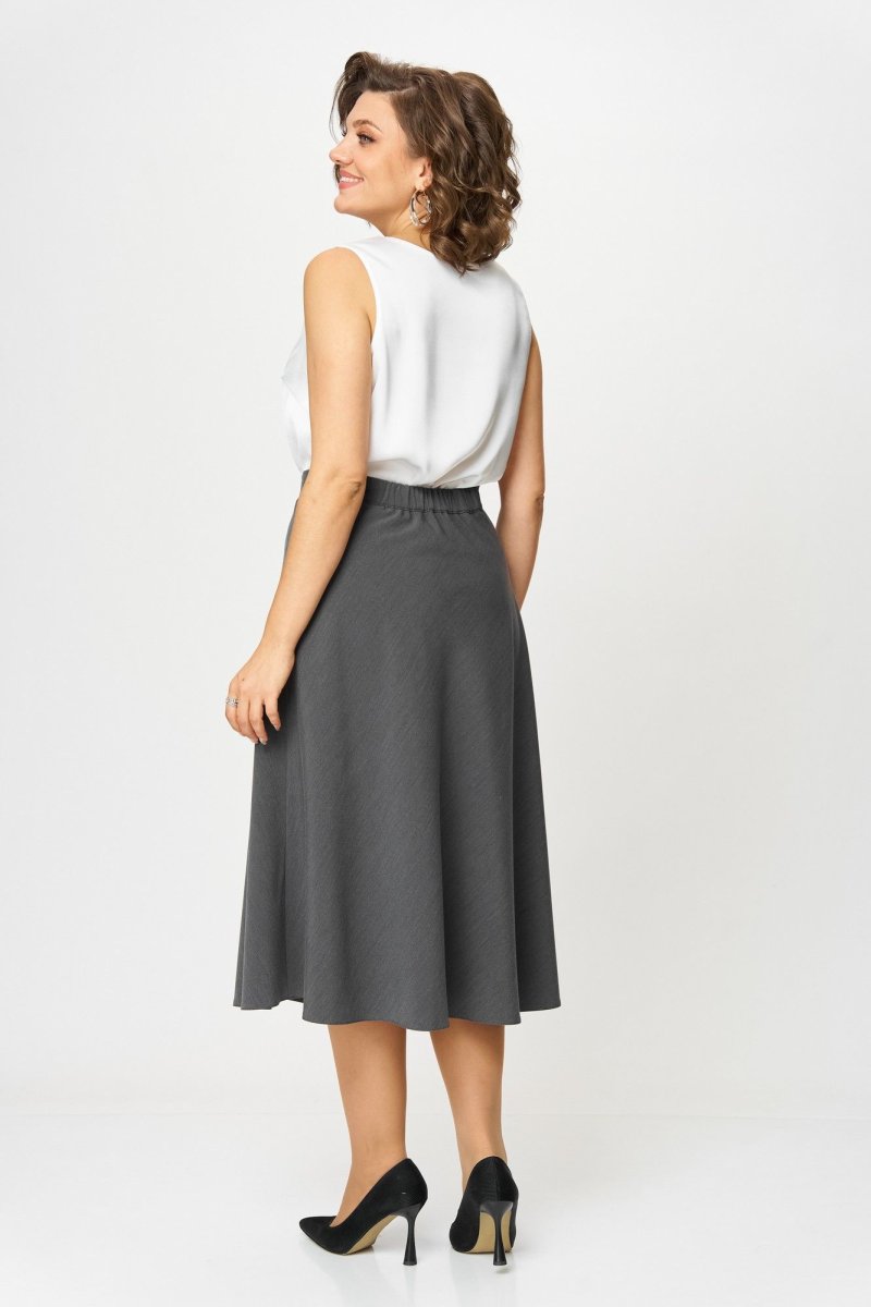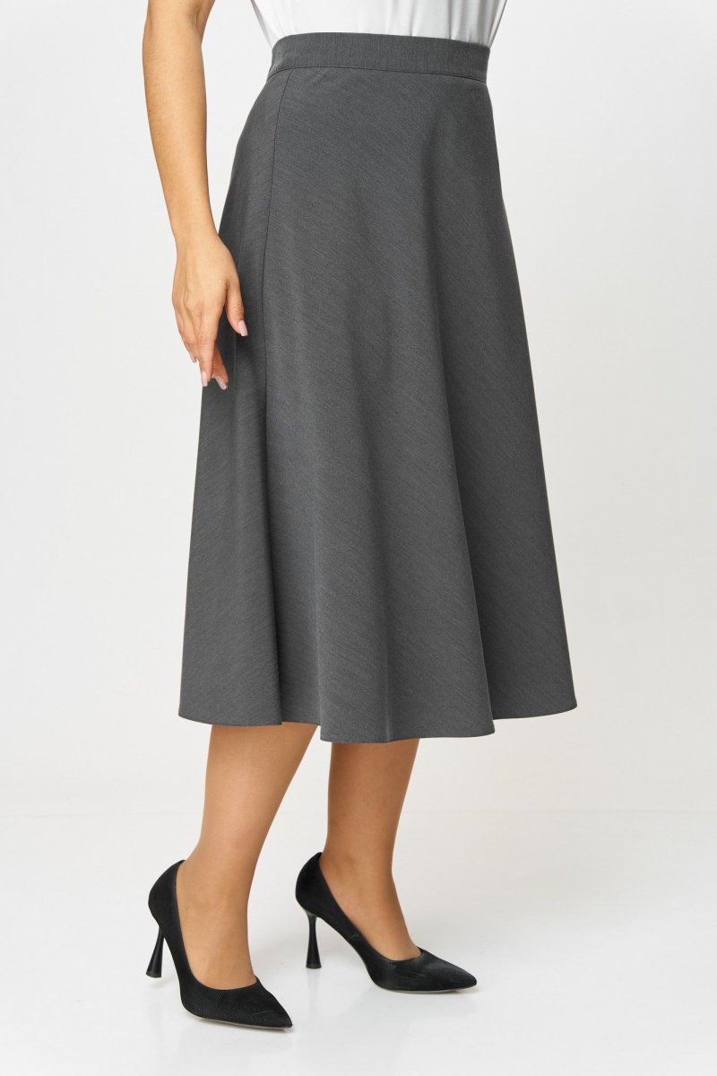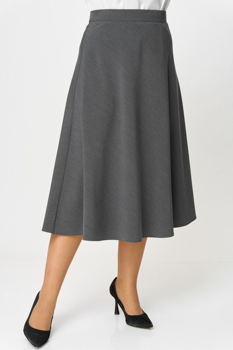 Юбка А-силуэта, длиной ниже колена.В левом боковом шве обработана застежка на потайную молнию. Юбка на притачном поясе с эластичной тесьмой по задней части пояса и застежкой на петлю и пуговицу по левому боковому шву.