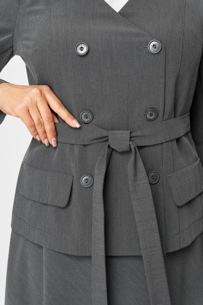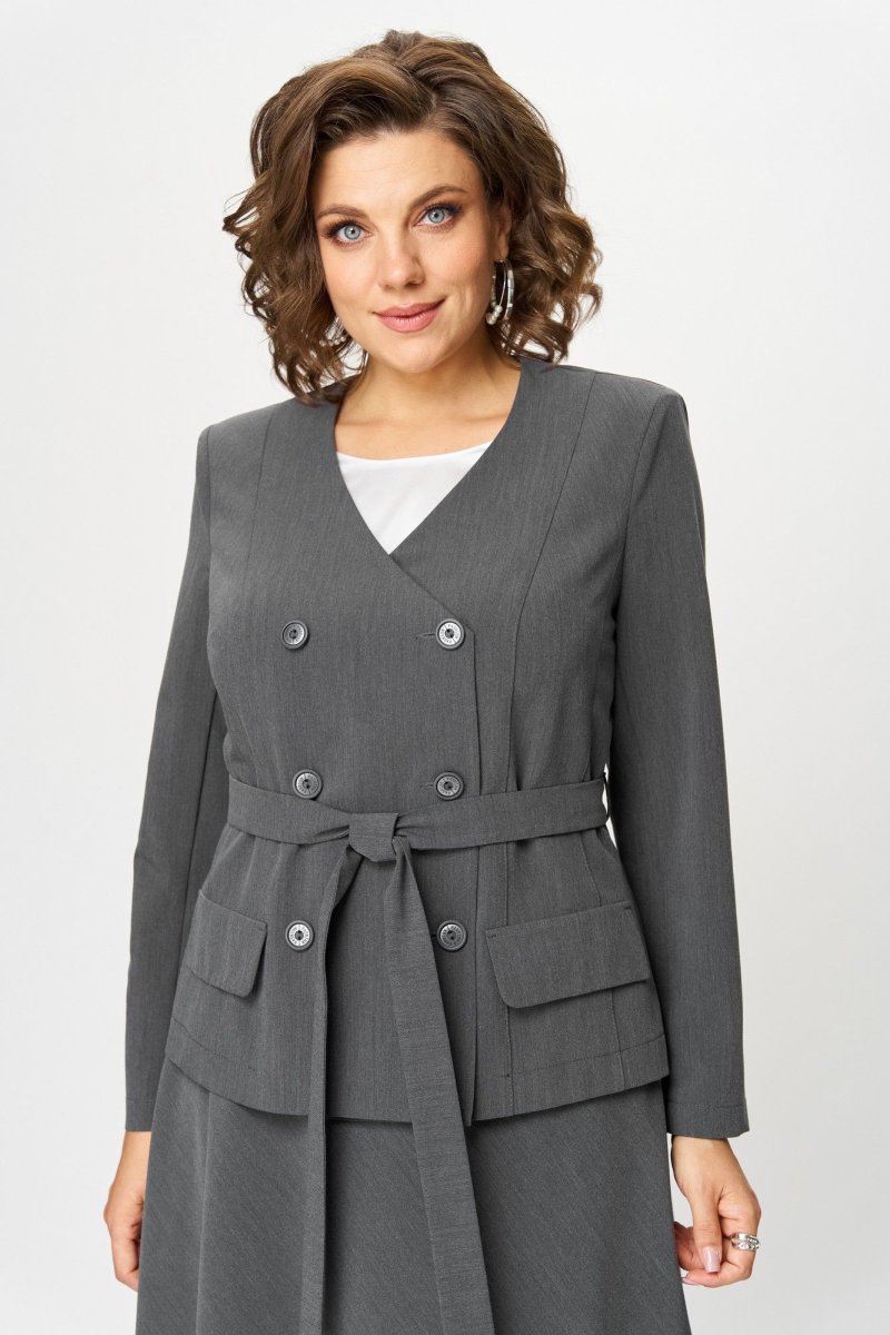 Жакет полуприлегающего силуэта. Полочка жакета с двубортной застежкой на петли и пуговицы, вертикальными рельефами и с настрочными декоративными клапанами. Горловина V-образной формы. Спинка со средним швом. По боковым швам в облати талии настрочены шлевки через которые продет пояс завязывающийся спереди. Рукав длинный, двухшовный.