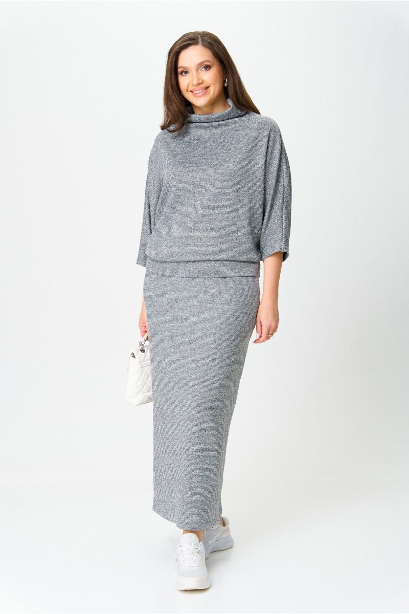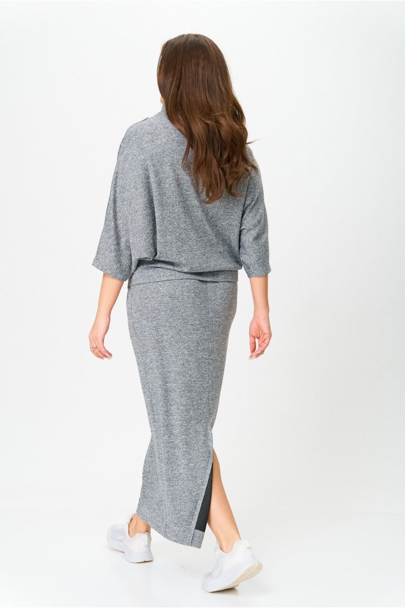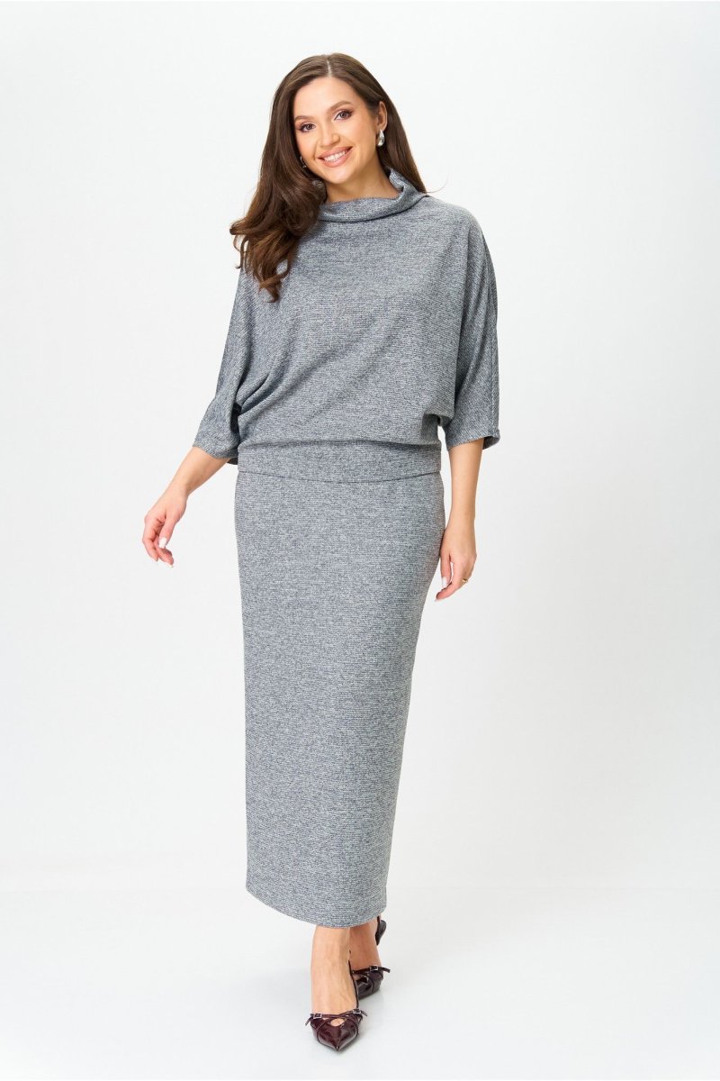Костюм от бренда «AXXA», состоящий из блузы со свободным спущенным плечом, рукавом типа «летучая мышь» и цельнокроеным воротником стойкой и стильной юбкой с высокой талией, поясом на широкой резинке. Спинка юбки со средним швом. Элегантный высокий разрез усиливает эффект стройности и создает комфорт при движении. Костюм выполнен из качественной трикотажной ткани с легким серебристым мерцанием.