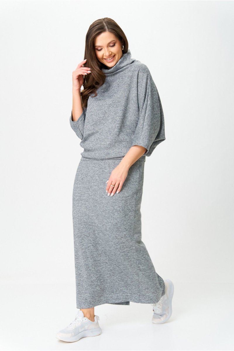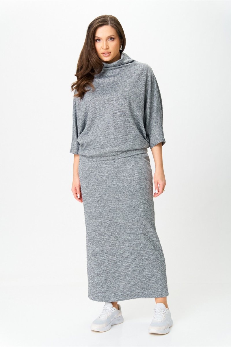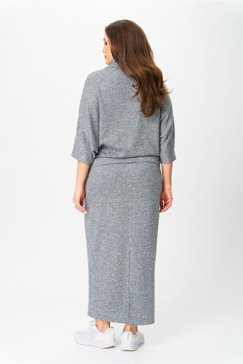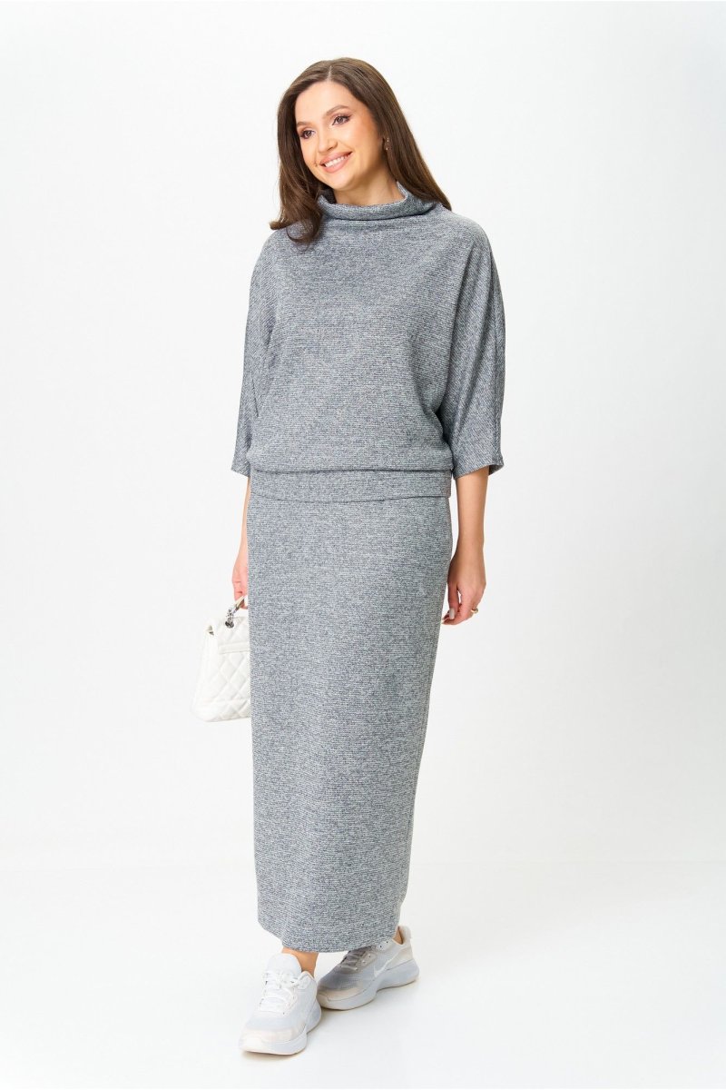 Костюм от бренда «AXXA», состоящий из блузы со свободным спущенным плечом, рукавом типа «летучая мышь» и цельнокроеным воротником стойкой и стильной юбкой с высокой талией, поясом на широкой резинке. Спинка юбки со средним швом. Элегантный высокий разрез усиливает эффект стройности и создает комфорт при движении. Костюм выполнен из качественной трикотажной ткани с легким серебристым мерцанием.