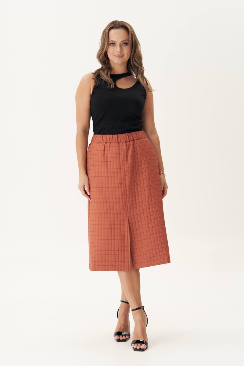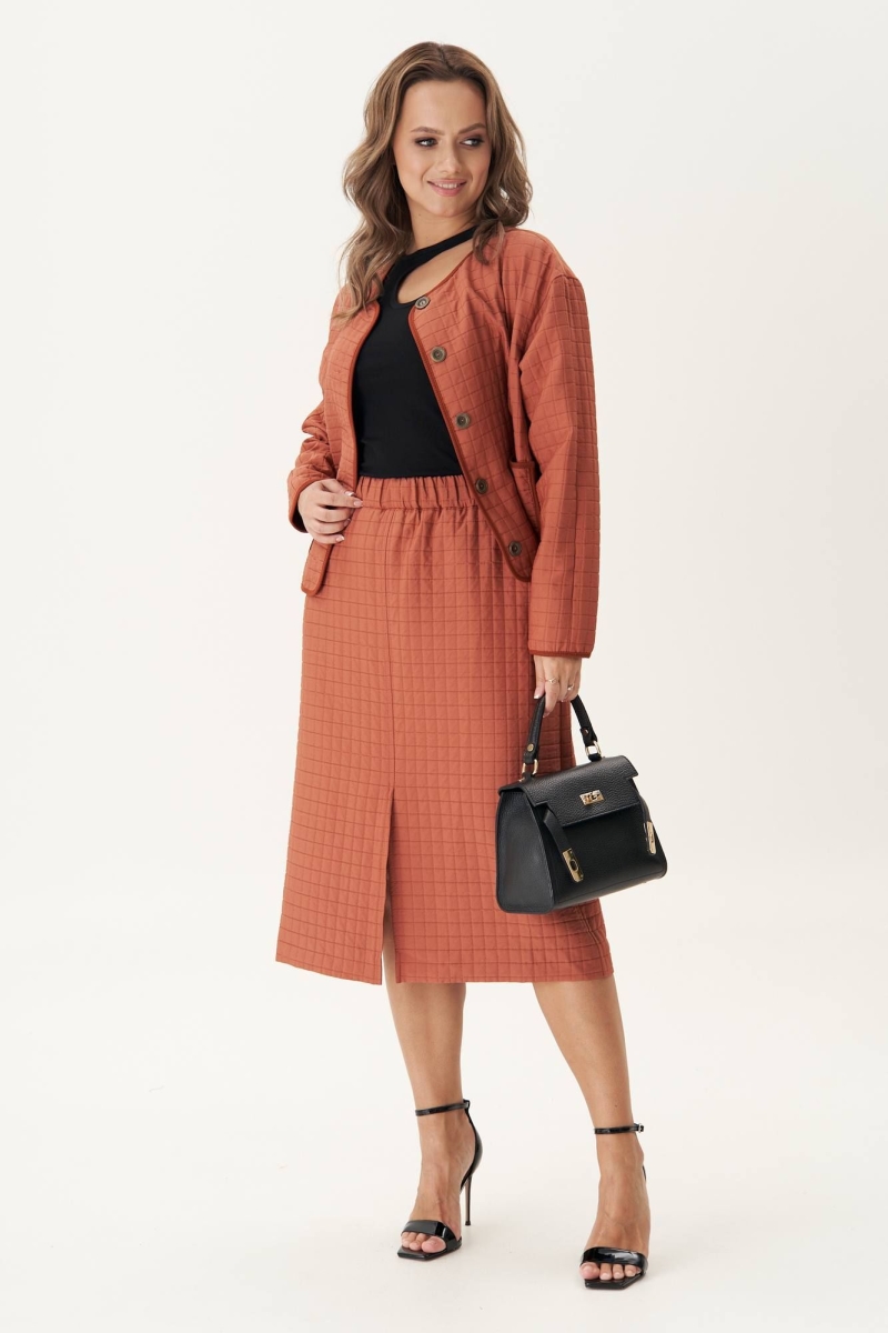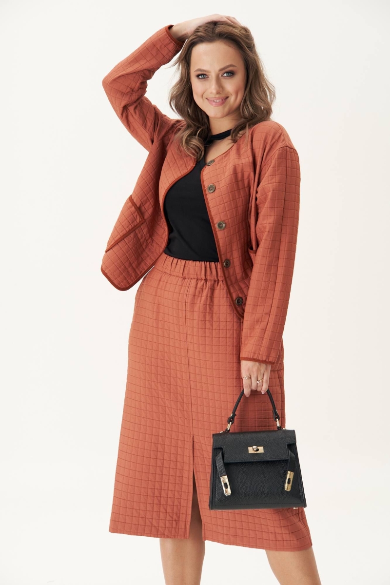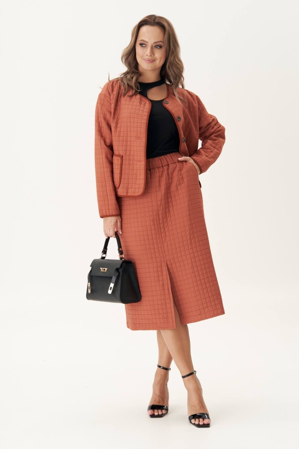 Если в одежде ты ценишь комфорт и практичность, то жакет и юбка миди из тонкого стеганого полотна – прекрасный вариант для привлекательного лука на каждый день. Ведь каждую вещь из данного комплекта можно носить независимо друг от друга. Свободный жакет упрямленного силуэта со слегка заниженной линией плеча, рукав втачной, слегка расширенный в верхней части, застежка центральная на петли и пуговицы. Полочка с накладными карманами. По краю борта, низкам рукавов, карманам и низу изделия – отделочная тесьма. Юбка А-образного силуэта, четырехклинка, на эластичном поясе с застежкой в боковом шве и эффектной шлицей спереди. Длина юбки около 70 см. Длина жакета около 52 см. Длина рукава с плечом около 73 см.