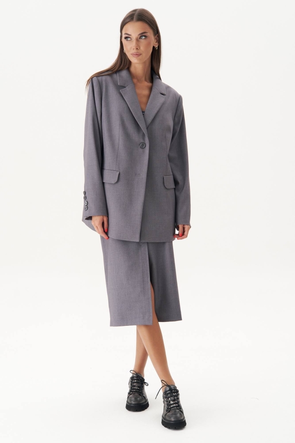 Костюм 3-ка. Жакет свободного расширенного силуэта, втачного покроя с центральной застёжкой и классическим английским воротником. Полочка с отрезным бочком, нагрудной вытачкой и прорезным карманом с клапаном. Спинка с центральным швом, высокой шлицей и отрезным бочком. Рукав двухшовный с отлетной шлицей и отделочными пуговицами.