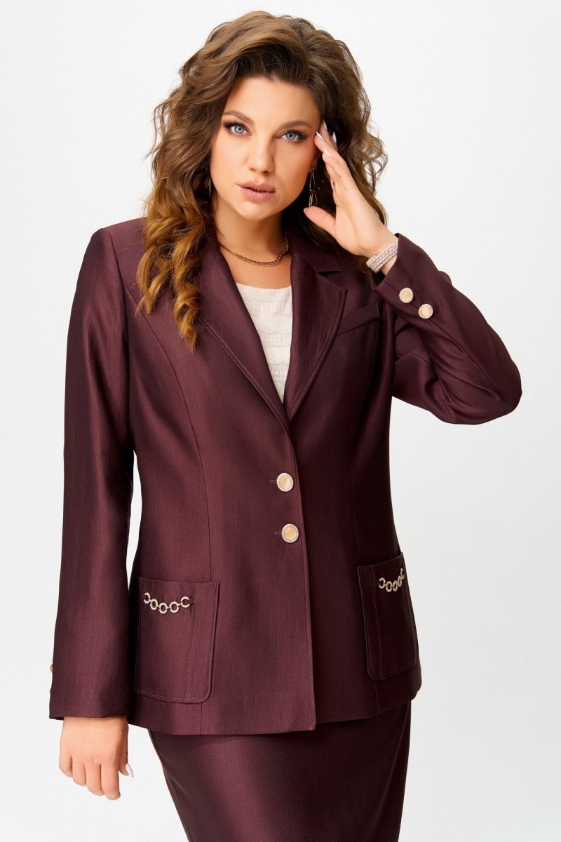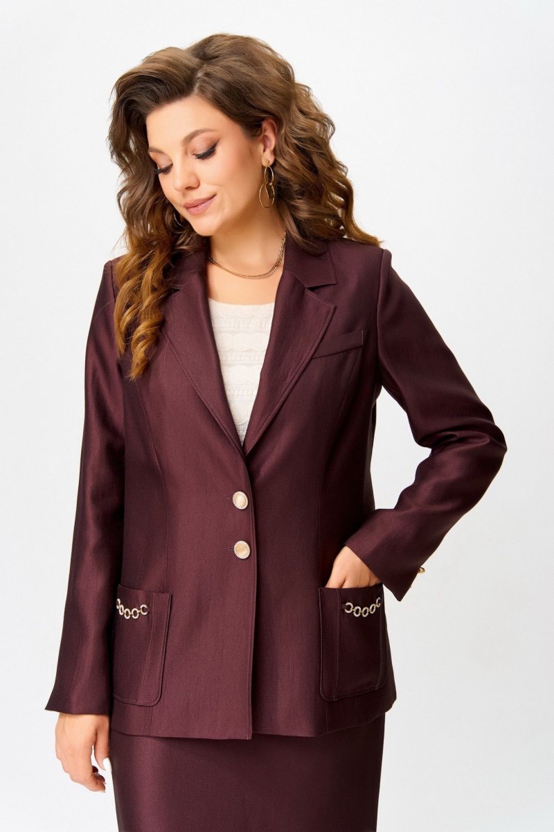 Полуприлегающий силуэт жакета на подкладке мягко очерчивает фигуру, будто повторяя её движения. Ткань "Лумина" с вискозой в составе играет на свету благородным блеском, придавая образу особую глубину. Однобортная застёжка на петли и пуговицы — классика, которая не теряет актуальности. Воротник и лацканы пиджачного типа добавляют строгости, а рельефы и накладные карманы с декоративной цепочкой — нотку изящного шика. Карман-обманка на левой полочке — как лёгкий флирт с традицией, а две декоративные пуговицы на рукавах — как драгоценные акценты, завершённые с ювелирной точностью. Средний шов по спинке — линия, соединяющая форму и содержание.