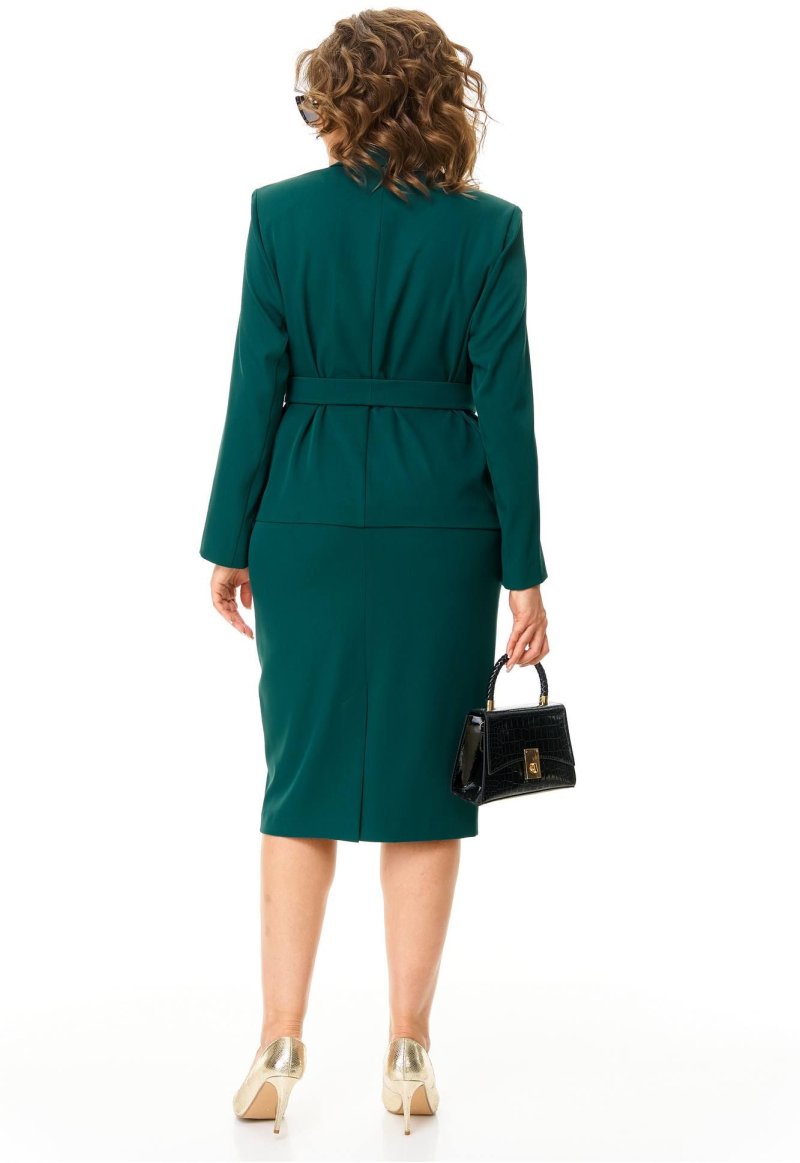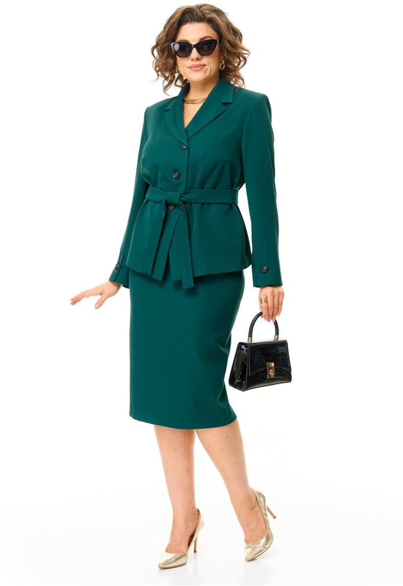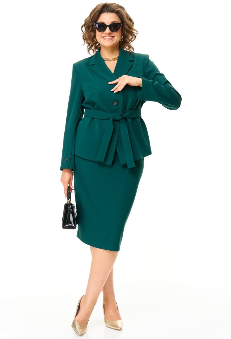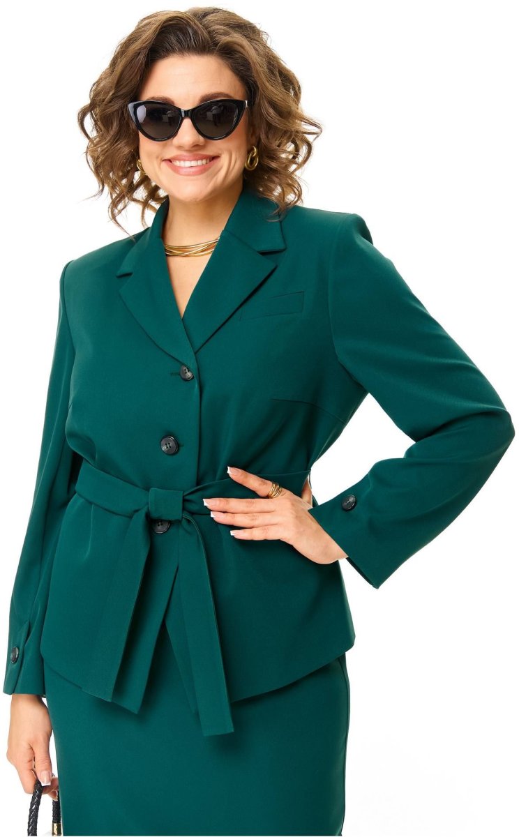 Жакет прямого силуэта. По переду нагрудные выточки, декоративная листочка. Воротник пиджачный. Застёжка центральная на 3 петли и пуговицы. Перед на подкладке. Рукав втачной двушовный, на передней половине внизу рукава отлетная шлица с декоративной пуговицей. Спинка прямая со средним швом. Приталивание жакета за счет съёмного мягкого пояса из основной ткани.