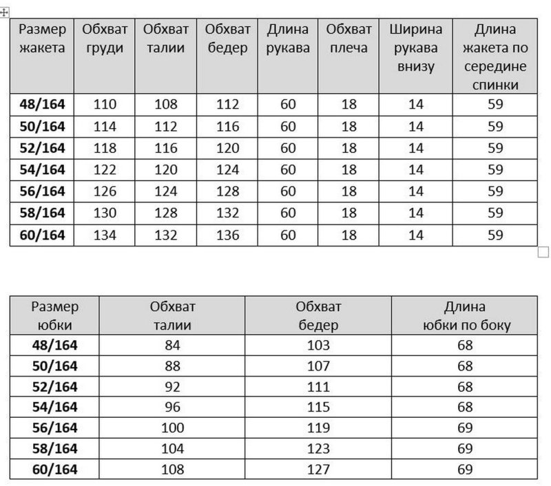 Таблица размеров