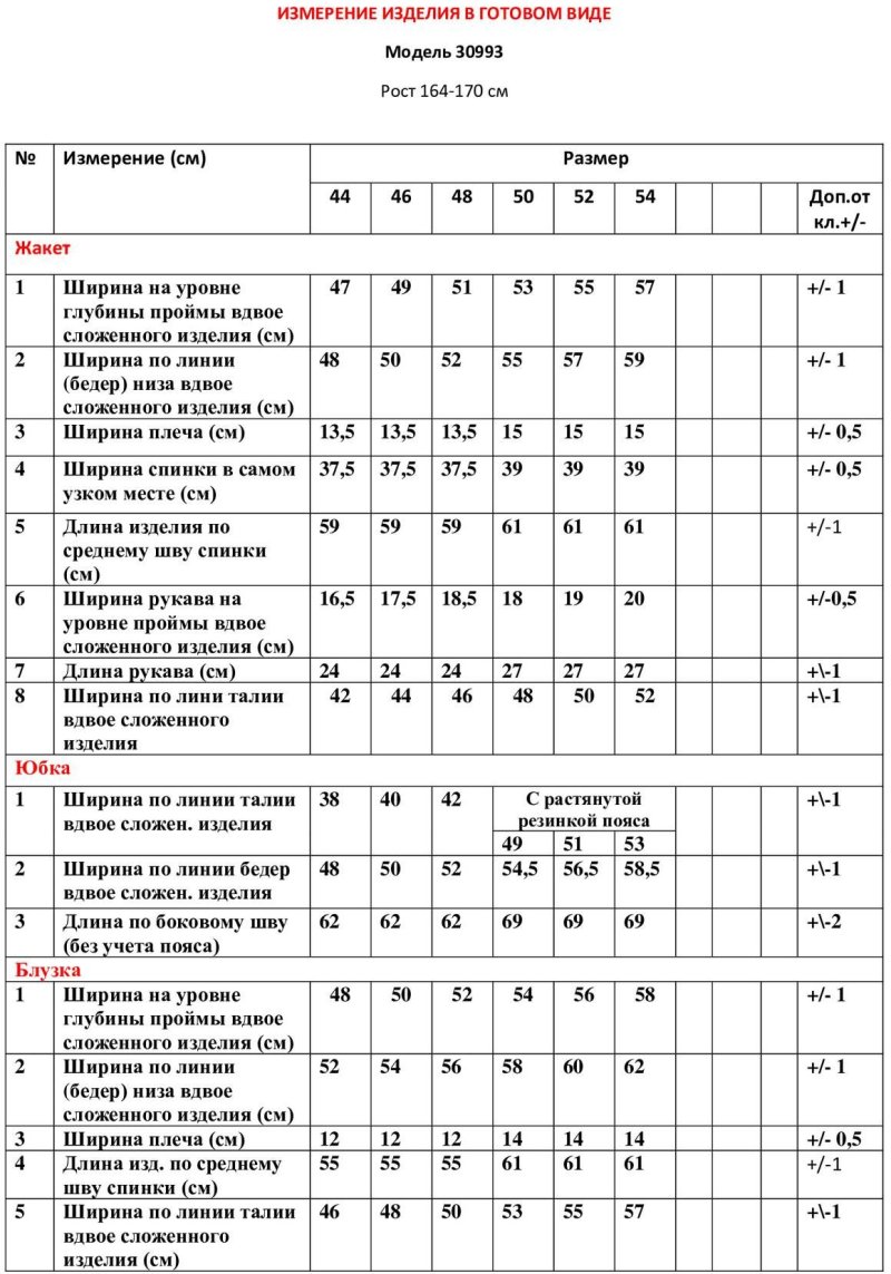 Костюм женский 3-х предметный, состоящий из блузы, жакета и юбки. Жакет полуприлегающего силуэта на подкладке. По переду и спинке рельефы, карманы отсутствуют, застежка на потайной крючок. Воротник фигурная цельнокроенная стойка. По талии есть баска, переходящая на спинку. Рукав втачной короткий без подкладки. Блуза женская полуприлегающего силуэта с круглым вырезом, с коротким рукавом. Юбка на подкладке зауженная к низу со шлицей. В р44-48 без пояса,в р 50-54 юбка на притачном поясе с резинкой. В среднем шве заднего полотнища застежка на потайную тесьму-молнию.