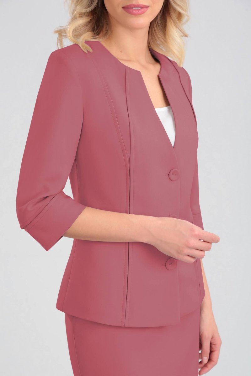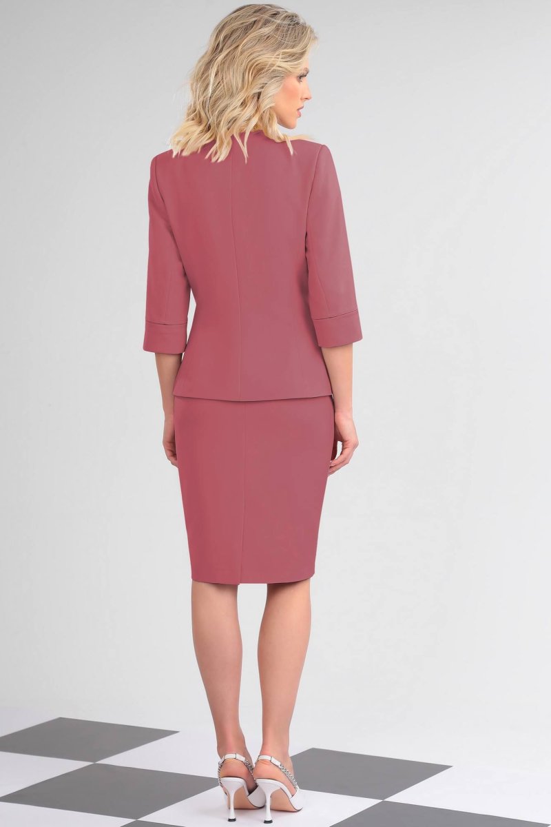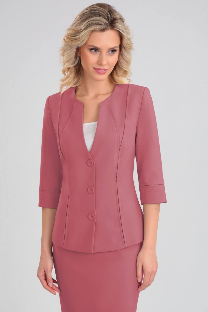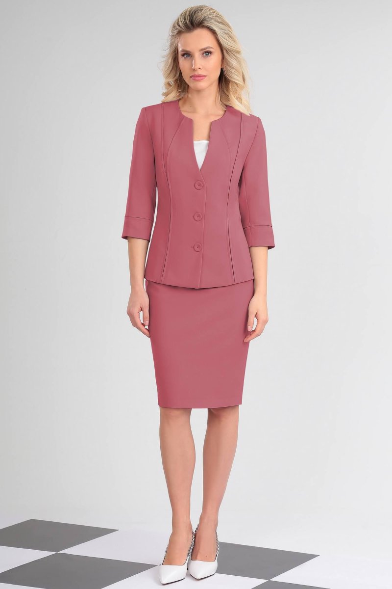Комплект женский состоящий из жакета, юбки и трикотажного топа. Жакет на подкладке, приталенного силуэта, втачного покроя. По переду фигурные рельефы в виде встречных защипов. Спинка со средним швом и вертикальными рельефами из проймы. Вырез горловины фигурный. Застежка центральная бортовая на 3 обтяжные пуговицы и петли. Рукав двухшовный длиной ниже линии локтя с манжетой по низу, шов манжеты рукава оформлен встречными защипами.