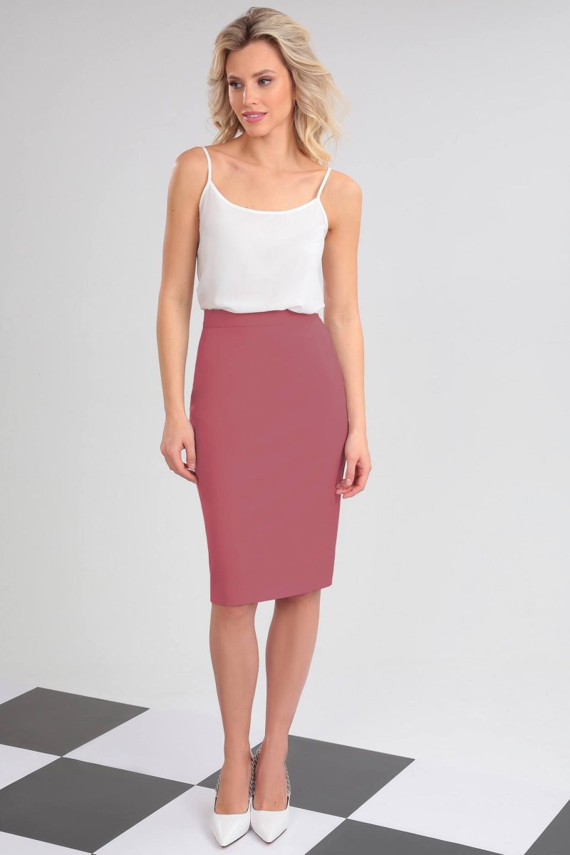 Юбка на подкладке, прямая, немного зауженная к низу, на прямом поясе, со шлицей. Застежка на потайную тесьму-молнию в среднем шве заднего полотнища.