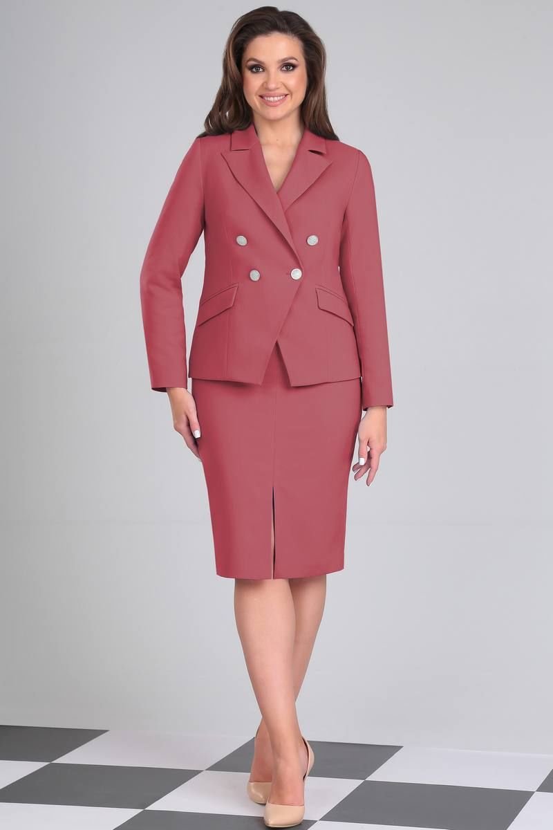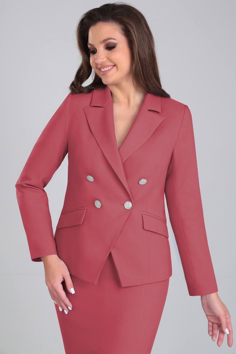 Комплект женский состоящий из жакета, юбки и блузки на бретелях. Жакет полуприлегающего силуэта на подкладке. По переду нагрудная выточка и прорезные функциональные карманы с клапаном. По спинке вертикальные рельефы из проймы и средний шов. Застежка ассиметричная (сверху двубортная, снизу однобортная) бортовая застегивающаяся на петли и декоративные пуговицы. Воротник пиджачного типа. Рукав втачной двухшовный длинный. Юбка на подкладке зауженная к низу на обтачке( без пояса). По переду фигурная кокетка и средний шов с разрезом. Застежка на потайную тесьму-молнию в среднем шве спинки.Топ из трикотажного полотна на узких регулируемых бретелях.