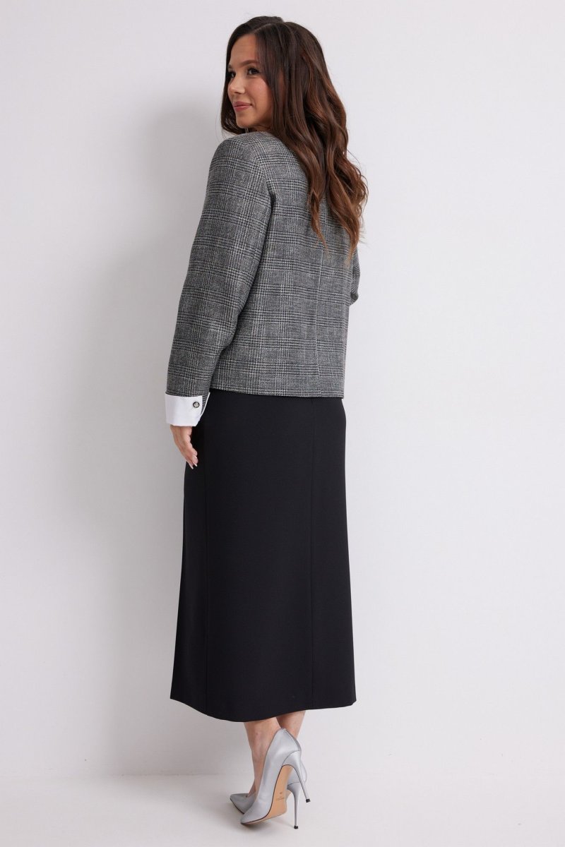 Стильный комплект из жакета и брюк. Жакет прямого кроя, на подкладке, с центральной застежкой на красивые пришивные пуговицы. Рукав втачной, дополнен съемными белыми манжетами. Выполнен жакет из красивой костюмной ткани. Юбка миди прямого кроя, на подкладке, с удобным разрезом спереди. Дополнена удобными боковыми и накладными задними карманами. Юбка с притачным поясом со шлевками для ремня, с застежкой по спинке на потайную молнию и пуговицу. Длина жакета от плечевого шва 60см. Длина рукава 60см. Длина юбки 83см.