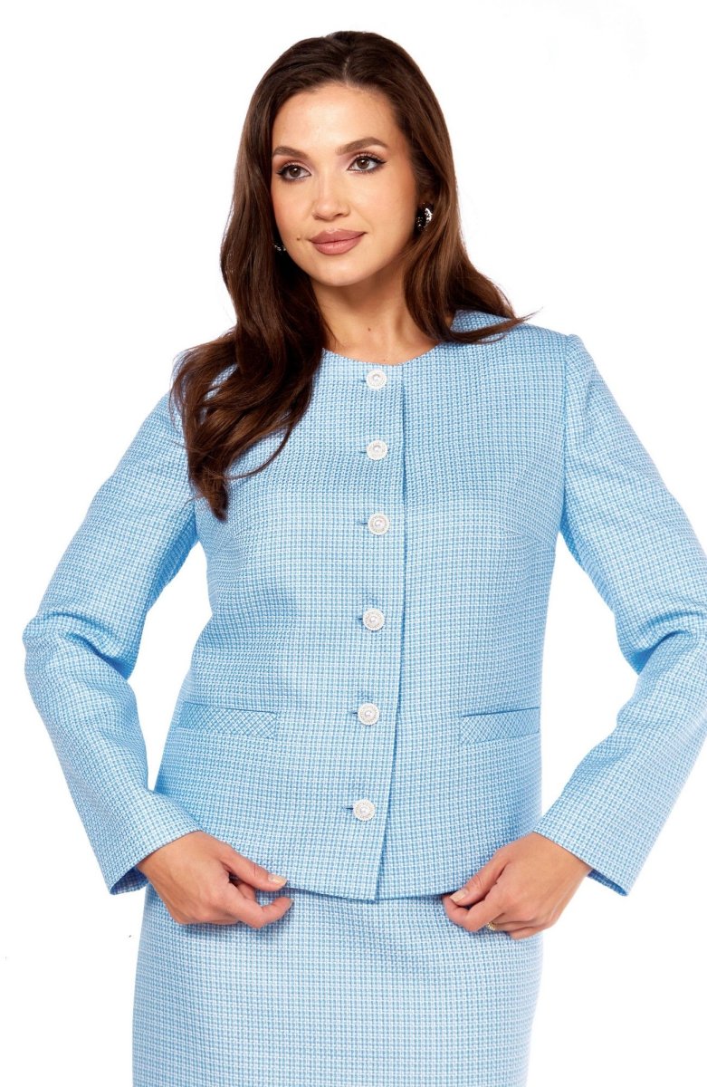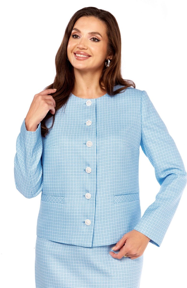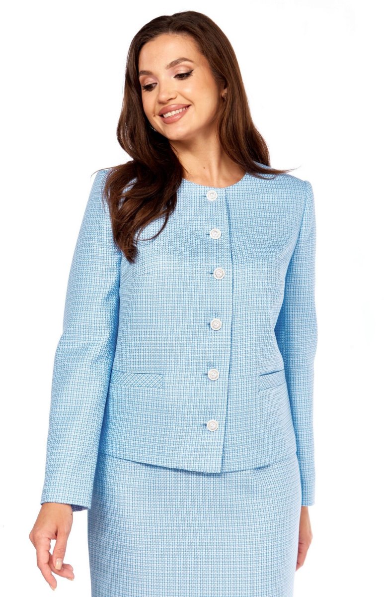 Комплект женский на подкладке в стиле "Шанель", состоящий из жакета и юбки. Жакет прямого силуэта. Спинка со средним швом и вытачками из плеча. Перед прорезными карманами. Рукав длинный двухшовный. Застежка в стык на потайной крючок, расположенный чуть выше талии. Юбка женская прямая зауженная к низу на обтачке. Перед с талиевыми вытачками, сзади талиевые вытачки и средний шов, вверху которого выполнена потайная молния, внизу шлица.