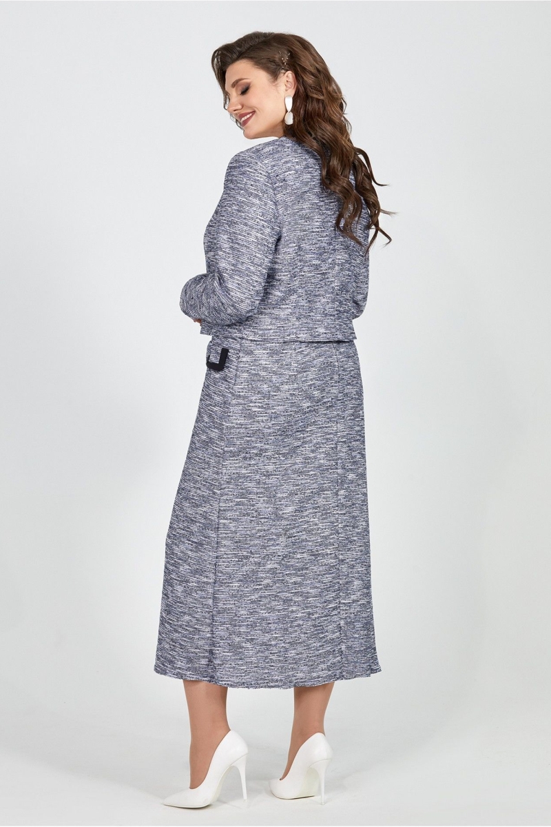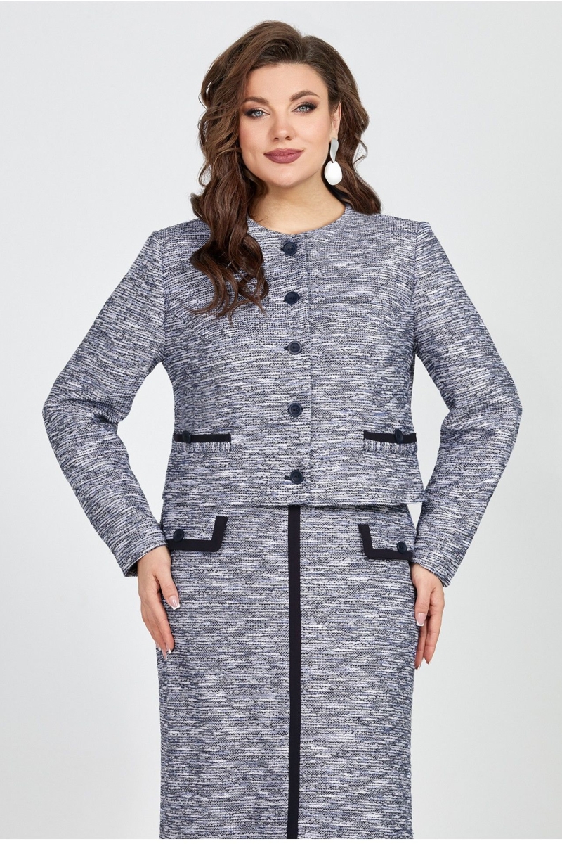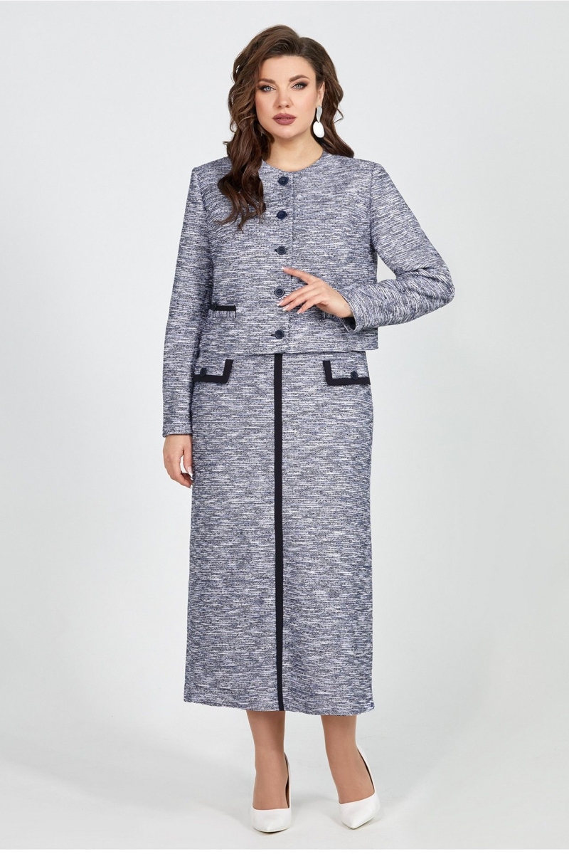 Элегантный, женский костюм, выполнен из меланжевого трикотажа, с отделкой из однотонного трикотажа, состоит из жакета и юбки. Жакет укороченный, свободного покроя, выполнен из меланжевого трикотажа, на подкладке. Горловина округлой формы, застежка по переду на петли-пуговицы. Также на полочке выполнены нагрудные вытачки и клапаны из меланжевого и однотонного трикотажа, декорированы пуговицами. Спинка из меланжевого трикотажа, со средним швом, рукав втачной, оптимальной длины. Юбка А-образного силуэта, выполнена из меланжевого трикотажа, верхний срез обработан поясом с вставкой резинки. По переднему полотнищу обработаны клапаны как и на жакете, по центру вставка из однотонного трикотажа. Застежка по среднему шву, на заднем полотнище. Элегантный женский костюм отличный выбор для женщин, которые ценят стиль и классику! в 52р. Жакет. Ширина груди- 55см, длина рукава- 61см, ширина рукава 19,5см. Юбка. Ширина талии -42см на резинке, Ширина бедер- 56см.