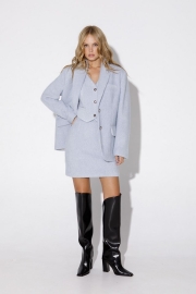 Костюм-тройка из оверсайз жакета, укороченного жилета и прямой мини-юбки из фактурной ткани. Детали: жакет прямого силуэта, расширенная линия плеч, пиджачный воротник, перед с прорезными функциональными карманами, однобортная застежка на петли и пуговицы, спинка со средним швом и шлицей, рукава втачные двухшовные, жакет на подкладке. Жилет прямого силуэта с фигурным низом, талиевые вытачки, застежка на петли и пуговицы, функциональные карманы, на подкладке. Юбка на притачном поясе, застежка сзади на потайную молнию, юбка на подкладке.