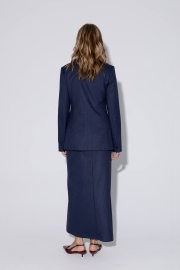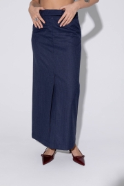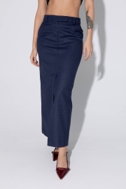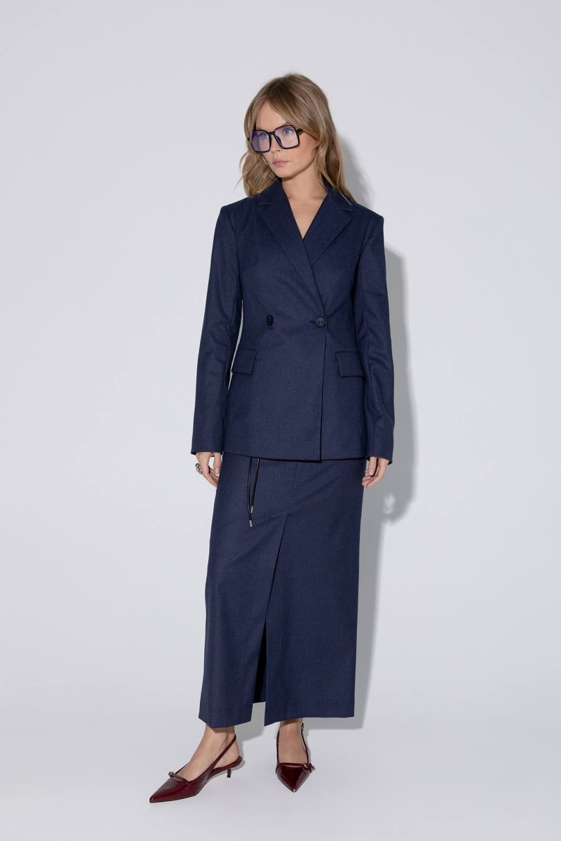 Костюм-двойка из приталенного двубортного жакета и прямой макси юбки из текстильной ткани в тонкую полоску. Детали: жакет с отрезными бочками и нагрудными вытачками, пиджачный воротник, функциональные карманы, двубортная застежка на петли и пуговицы, спинка со средним швом, втачные двухшовные рукава, жакет на подкладке. Юбка на притачном поясе со шлевками, талиевые вытачки, боковые карманы, застежка на потайную молнию, на подкладке. Длина жакета по спинке около 68 см в размерах 40-46 и около 71 см в размерах 48-52, длина рукава около 61 см. Длина юбки по боковому шву с поясом около 95 см в размерах 40-52 см