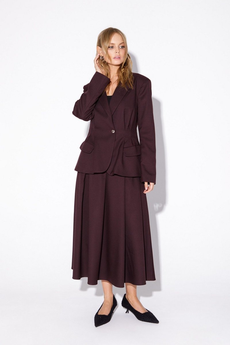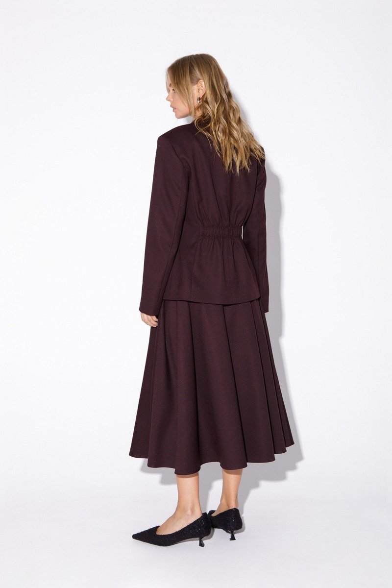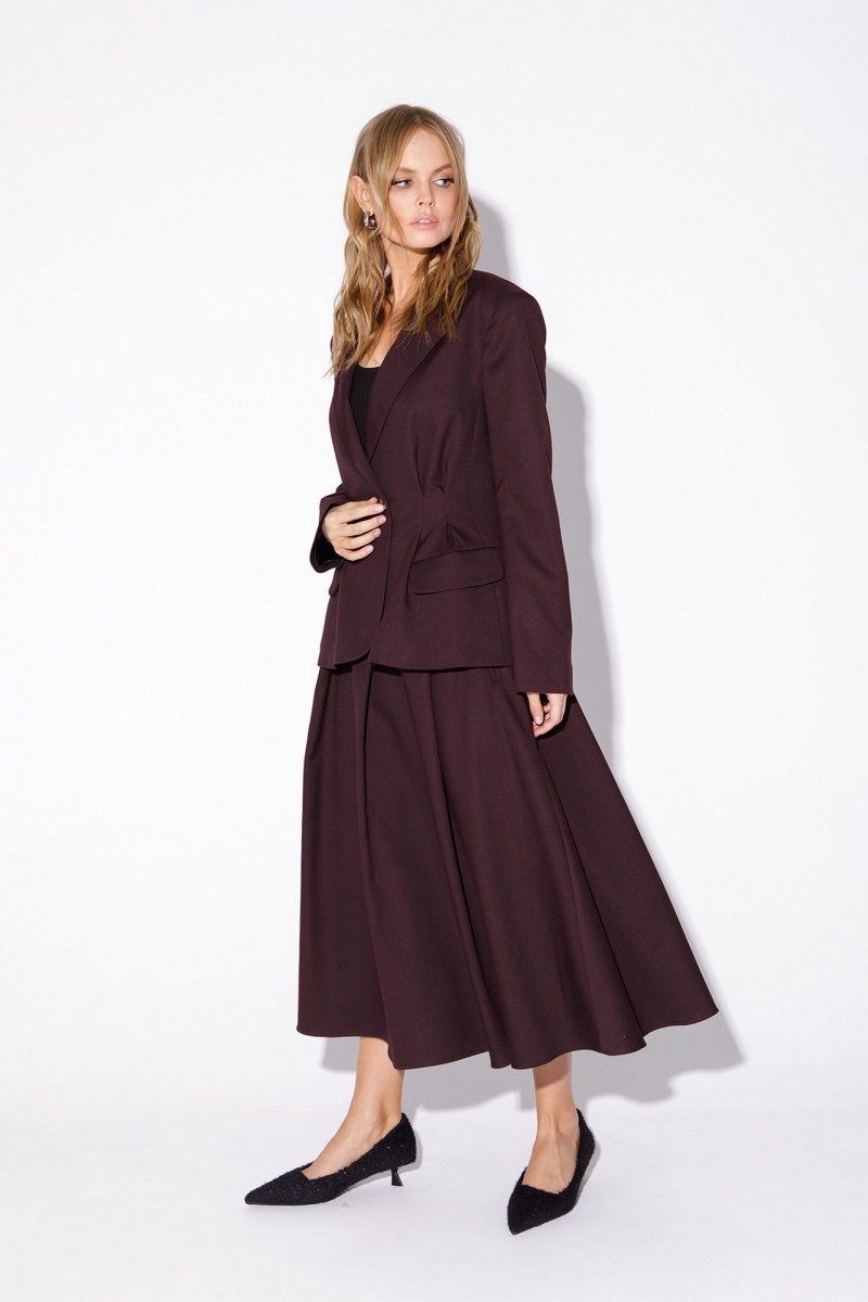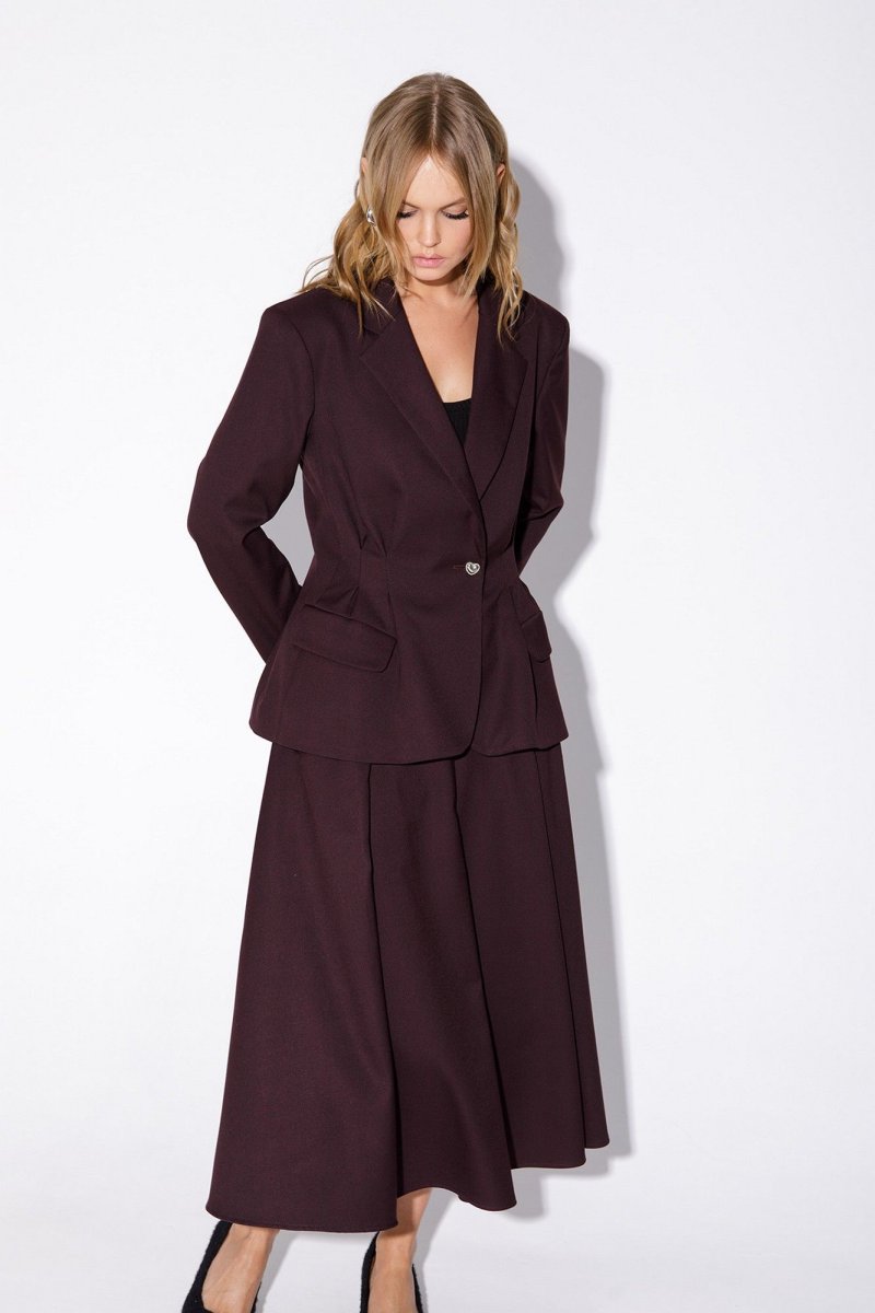 Текстильный костюм-двойка из укороченного приталенного жакета со складками и миди-юбки. Детали: пиджачный воротник, перед с функциональными карманами, застежка на одну петлю и пуговицу, рукава втачные двухшовные, спинка с рельефами и резинкой по талии. Жакет на подкладке. Юбка на притачном поясе со шлевками, прорезные карманы, застежка на потайную молнию в левом боковом шве, юбка на подкладке. Длина жакета по спинке около 64 см в размерах 40-46 и около 67 см в размерах 48-52, длина рукава около 61 см. Длина юбки по боковому шву с поясом около 80 см