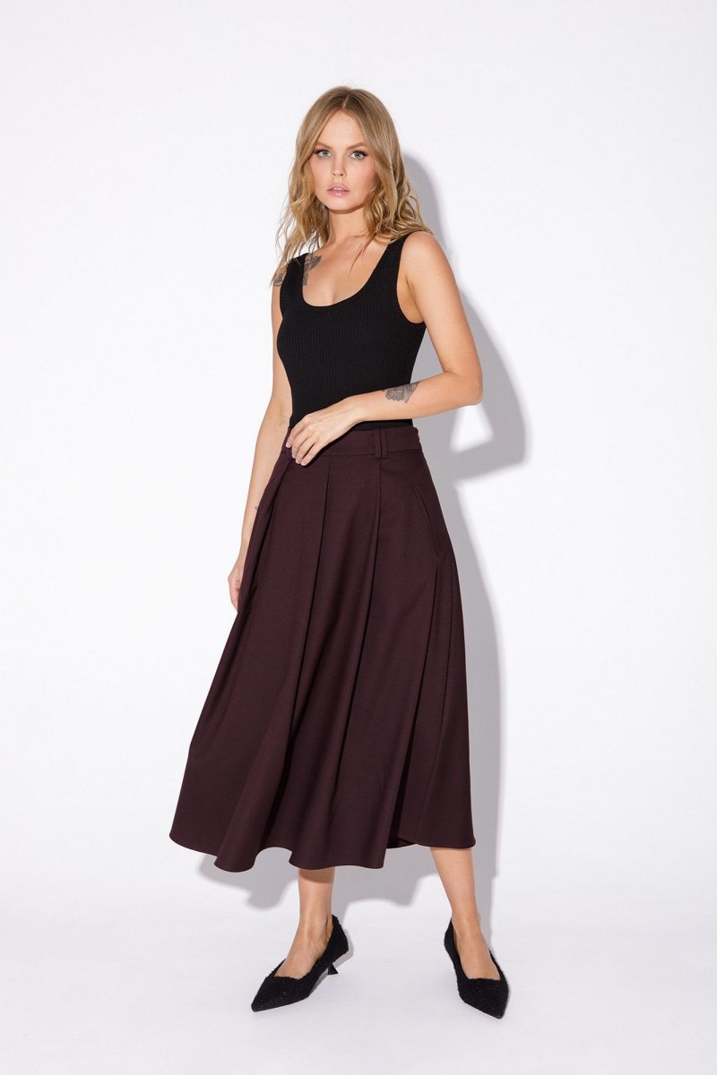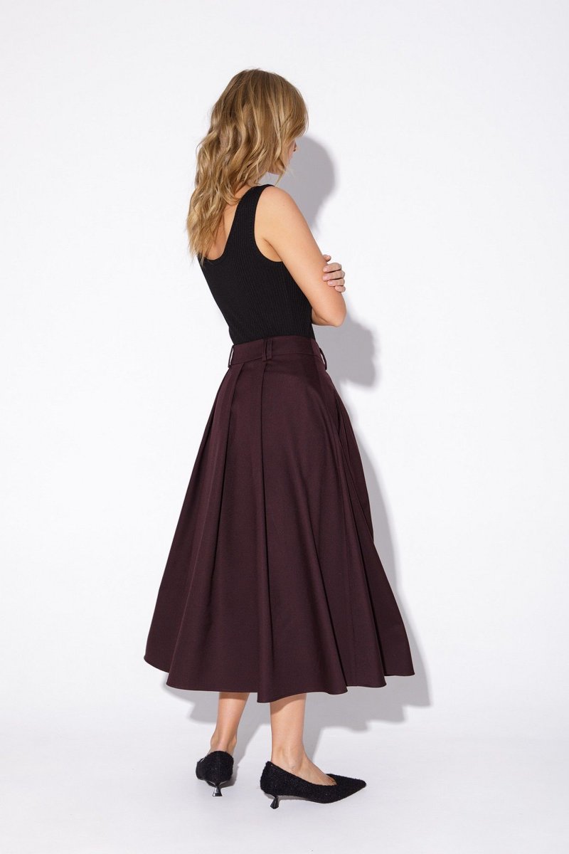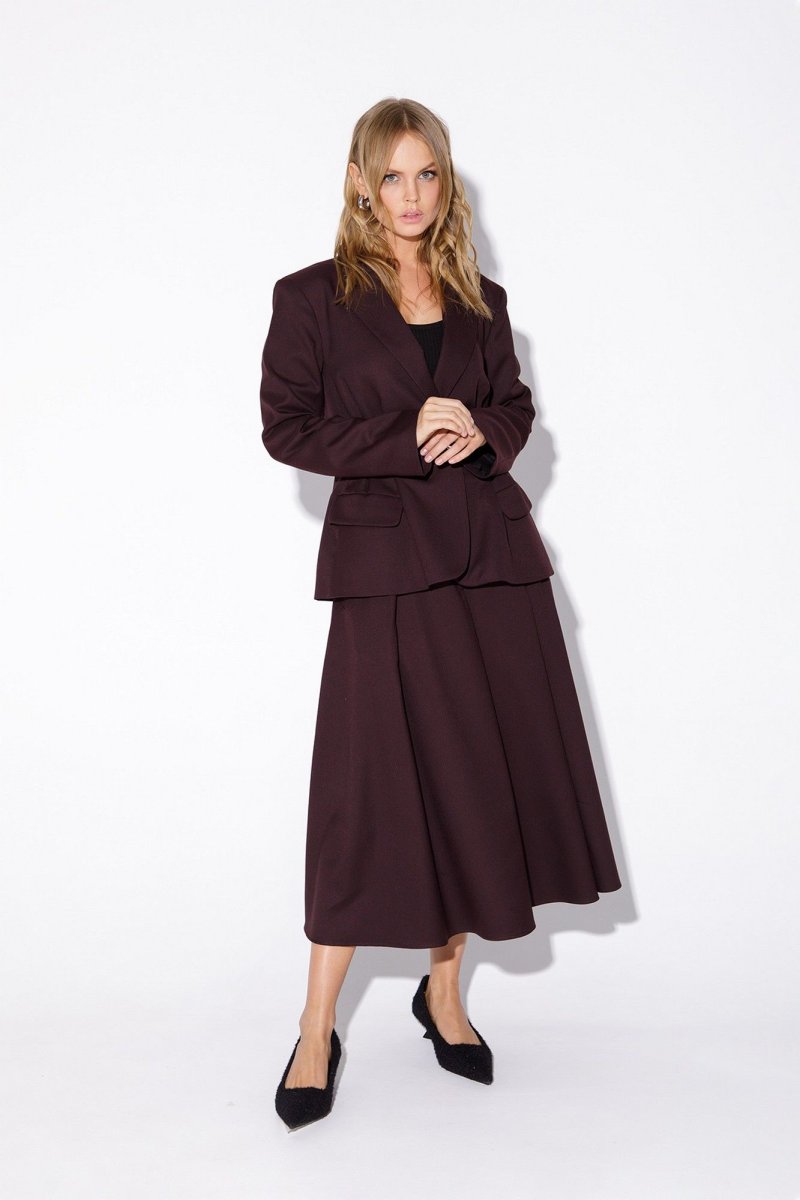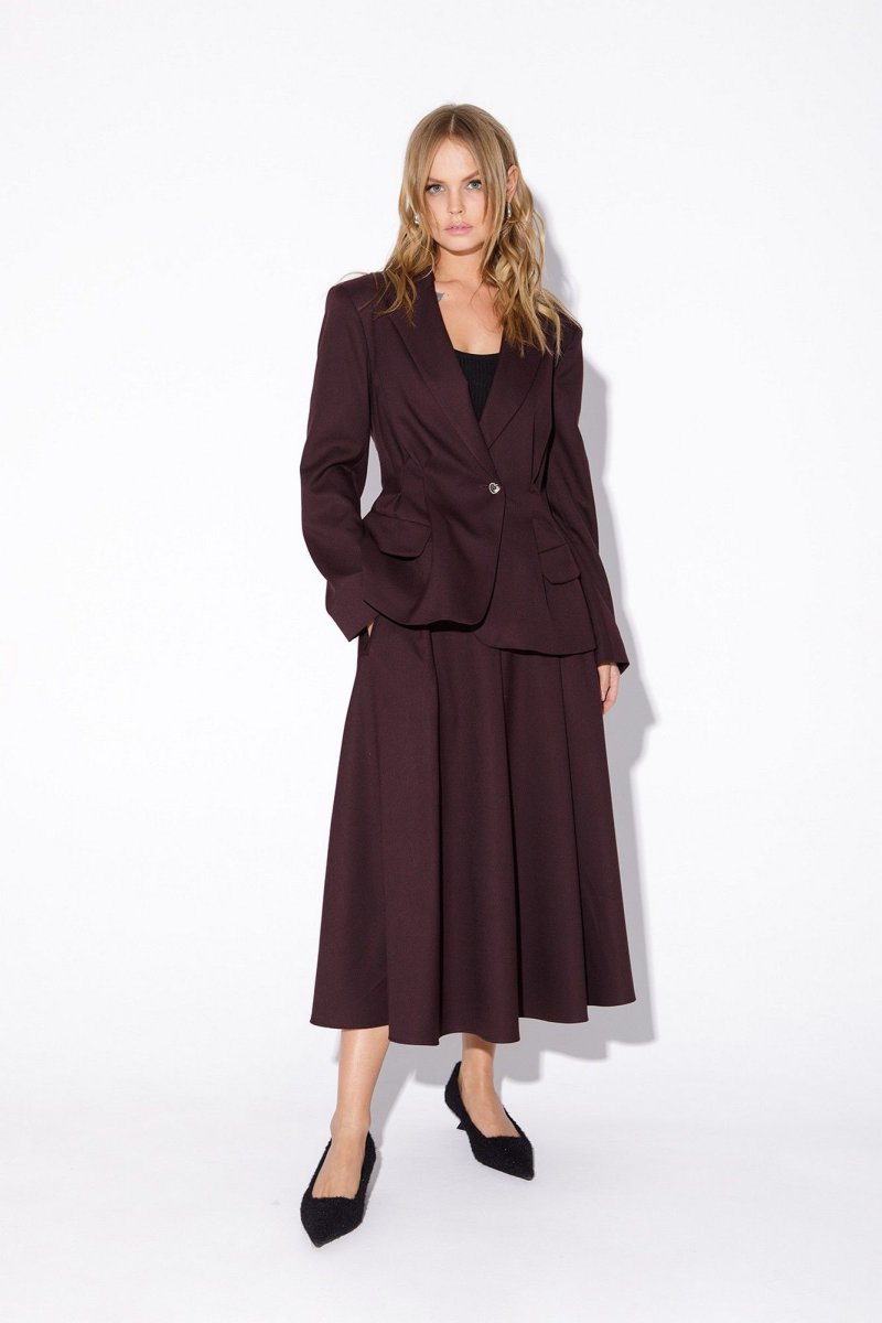 Текстильный костюм-двойка из укороченного приталенного жакета со складками и миди-юбки. Детали: пиджачный воротник, перед с функциональными карманами, застежка на одну петлю и пуговицу, рукава втачные двухшовные, спинка с рельефами и резинкой по талии. Жакет на подкладке. Юбка на притачном поясе со шлевками, прорезные карманы, застежка на потайную молнию в левом боковом шве, юбка на подкладке. Длина жакета по спинке около 64 см в размерах 40-46 и около 67 см в размерах 48-52, длина рукава около 61 см. Длина юбки по боковому шву с поясом около 80 см