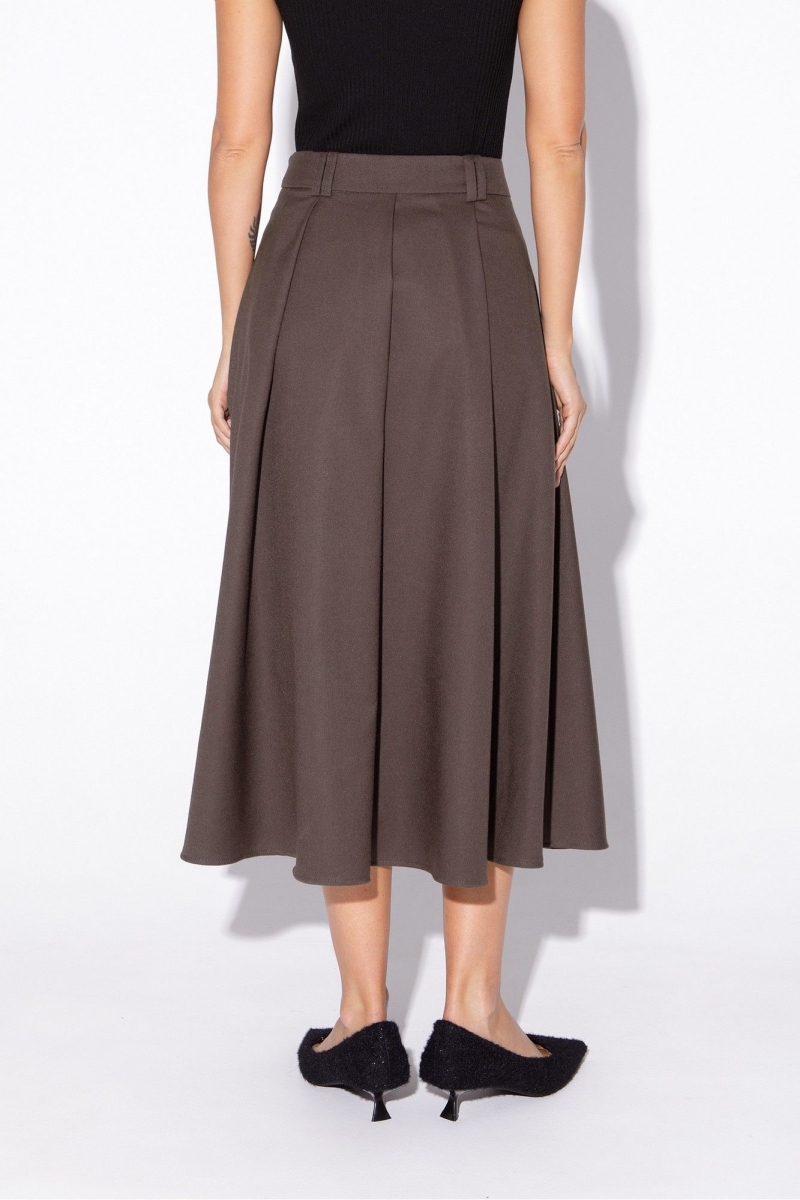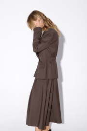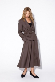 Текстильный костюм-двойка из укороченного приталенного жакета со складками и миди-юбки. Детали: пиджачный воротник, перед с функциональными карманами, застежка на одну петлю и пуговицу, рукава втачные двухшовные, спинка с рельефами и резинкой по талии. Жакет на подкладке. Юбка на притачном поясе со шлевками, прорезные карманы, застежка на потайную молнию в левом боковом шве, юбка на подкладке. Длина жакета по спинке около 64 см в размерах 40-46 и около 67 см в размерах 48-52, длина рукава около 61 см. Длина юбки по боковому шву с поясом около 80 см