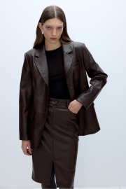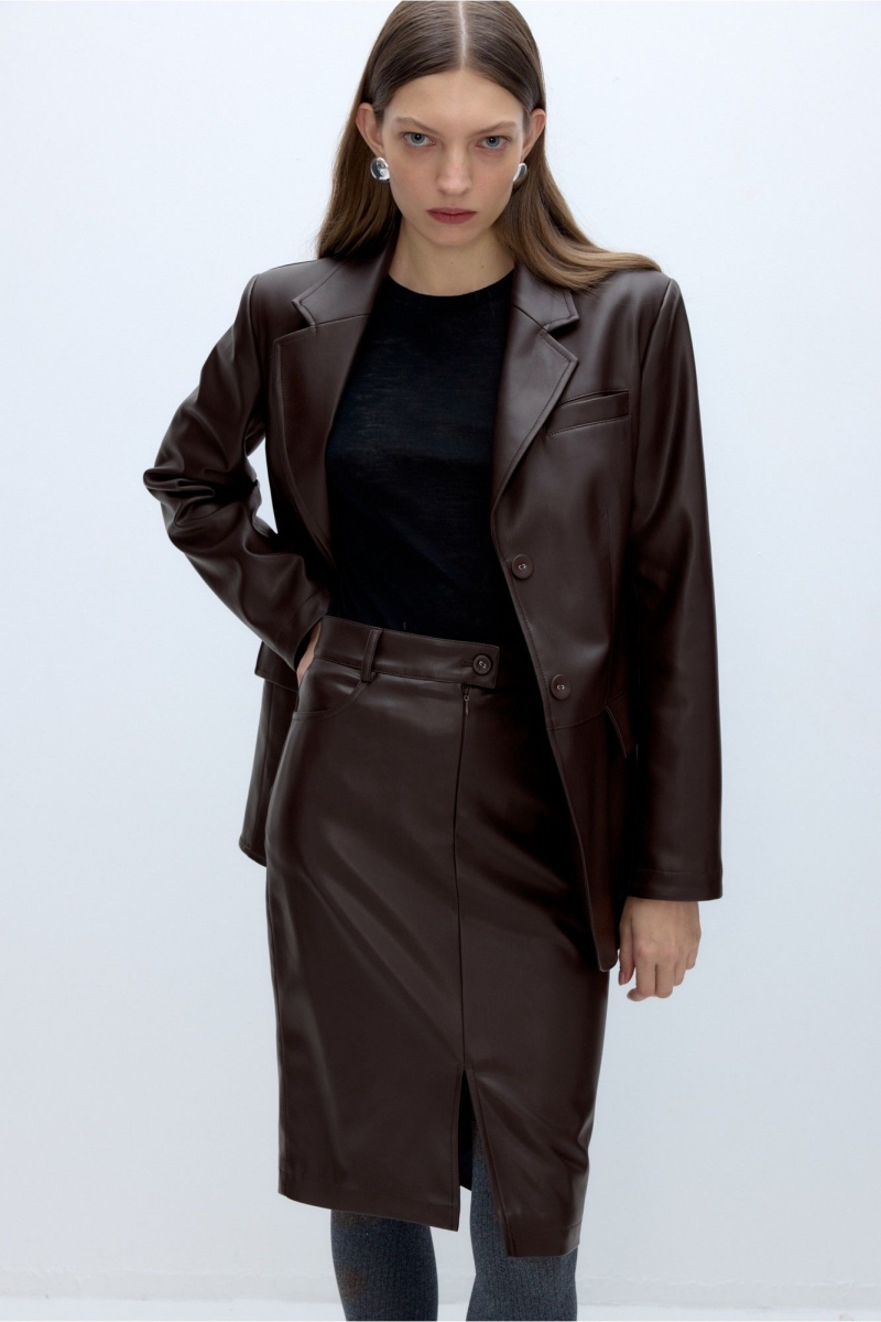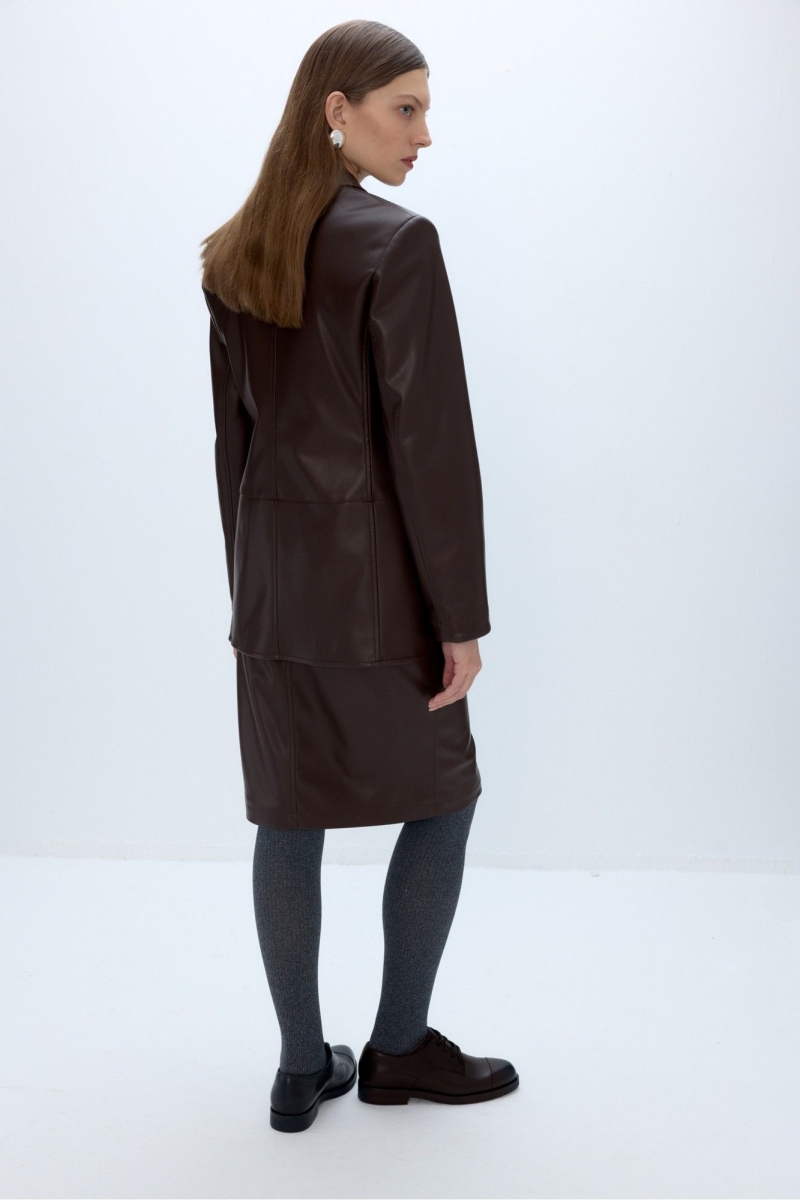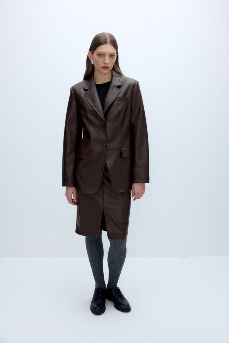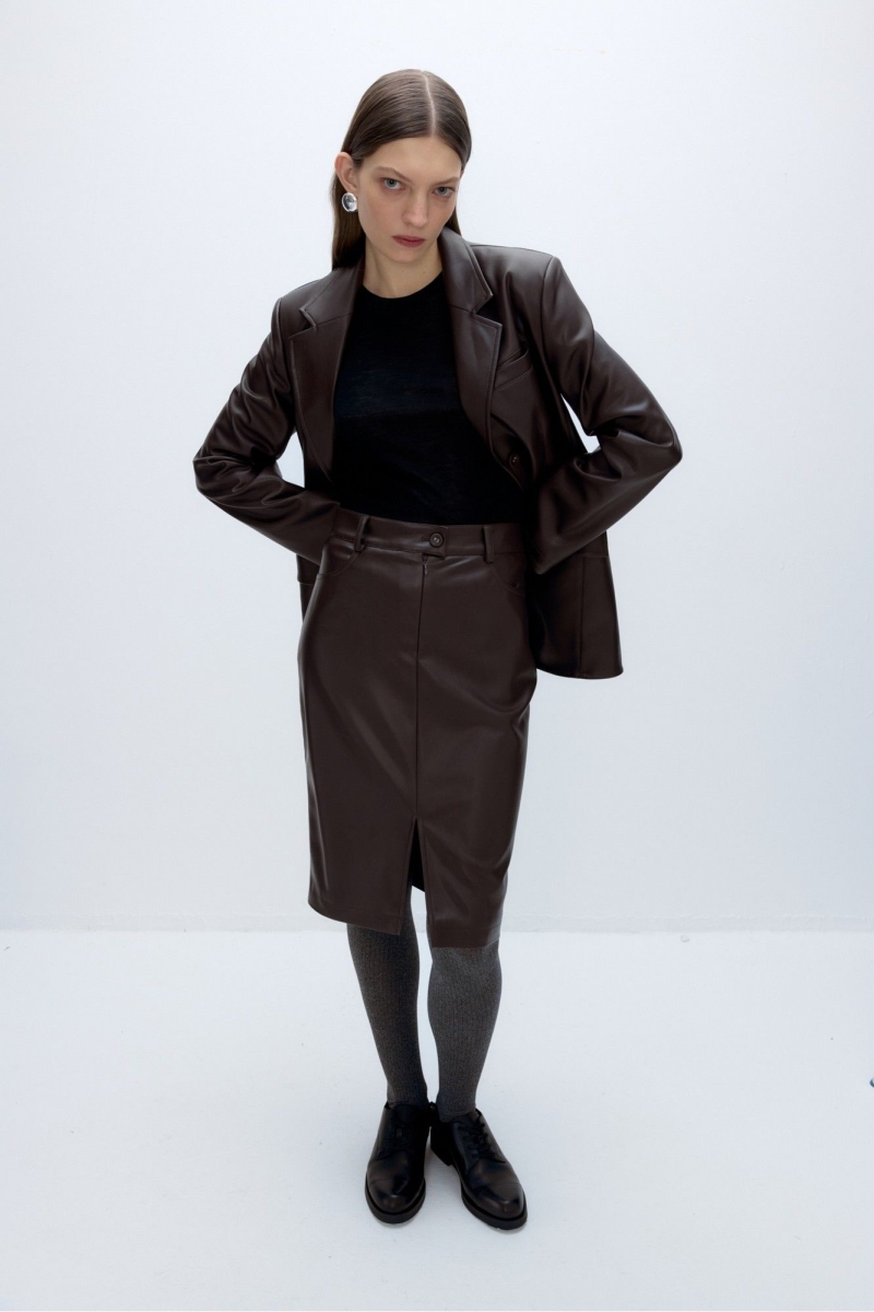 Детали: прямой силуэт, пиджачный воротник, функциональные карманы, застежка на петли и пуговицы, рукава втачные двухшовные, жакет на подкладке. Юбка на притачном поясе со шлевками, талиевые вытачки, боковые карманы, застежка на потайную молнию, на подкладке. Длина жакета по спинке около 70 см в размерах 40-46 и около 72 см в размерах 48-52, длина рукава около 62 см. Длина юбки по боковому шву с поясом около 61 см в размерах 40-52 см