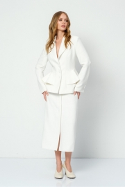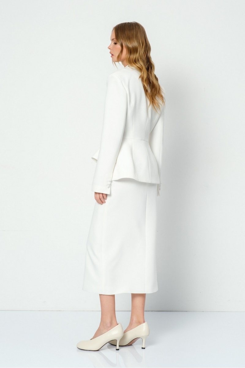 Текстильный костюм-двойка из приталенного жакета и прямой миди-юбки с кружевом. Детали: жакет полуприлегающего силуэта, рельефы переда и спинки, пиджачный воротник, перед с отлетными деталями, застежка на петли и декоративные пуговицы, отрезная линия талии по спинке, втачные длинные рукава со шлицами, жакет на подкладке. Юбка с высокой посадкой, талиевые вытачки, перед с застежкой на потайные петли и пуговицы, нижняя юбка с широким притачным кружевом, шлевки, спинка с застежкой на потайную молнию, на подкладке. Длина жакета по спинке около 64 см в размерах 40-46 и около 67 см в размерах 48-52, длина рукавов около 61,5 см. Длина юбки по боковому шву с поясом около 80 см.