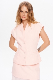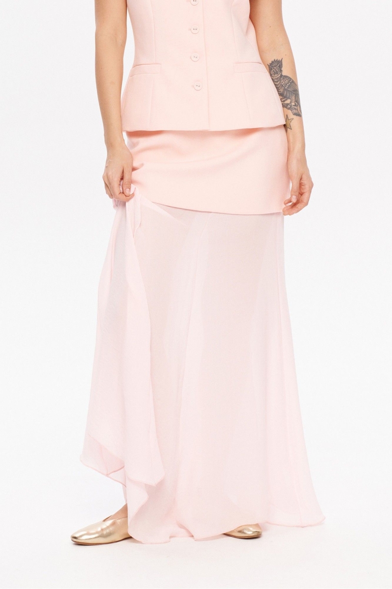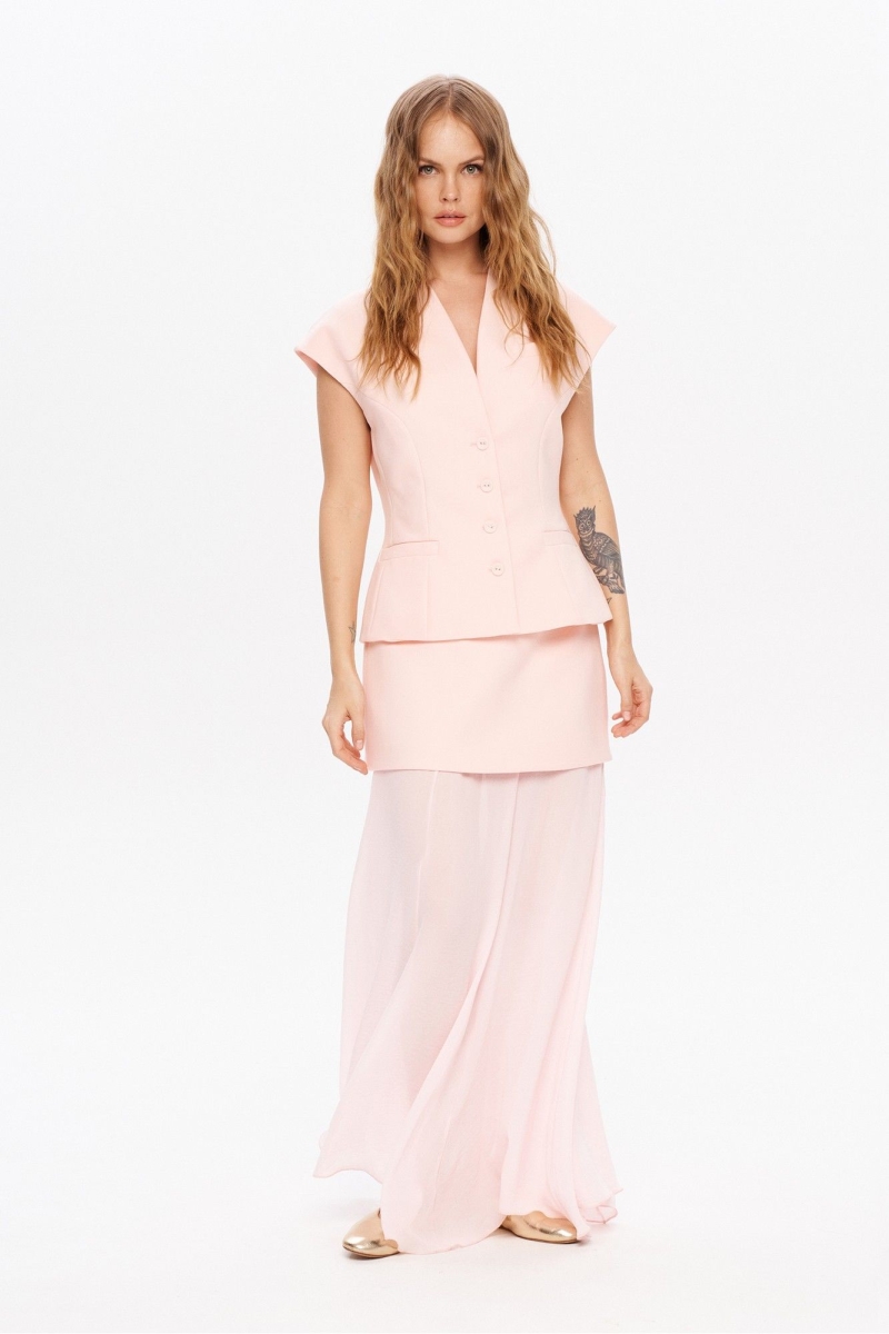 Костюм-двойка из приталенного жилета с воротником-стойкой и макси-юбки. Детали: полуприлегающий силуэт, цельнокроеный воротник-стойка, рельефные швы переда и спинки, функциональные карманы, застежка на петли и пуговицы, жилет на подкладке. Юбка с талиевыми вытачками, застежка на потайную молнию в левом боковом шве, верхняя мини-юбка на подкладке. Длина жилета по спинке около 54 см в размерах 40-46 и около 56 см в размерах 48-52. Длина мини-юбки по боковому шву около 35,5 см в размерах 40-46 и около 37,5 см в размерах 48-52. Длина макси-юбки по боковому шву около 101 см