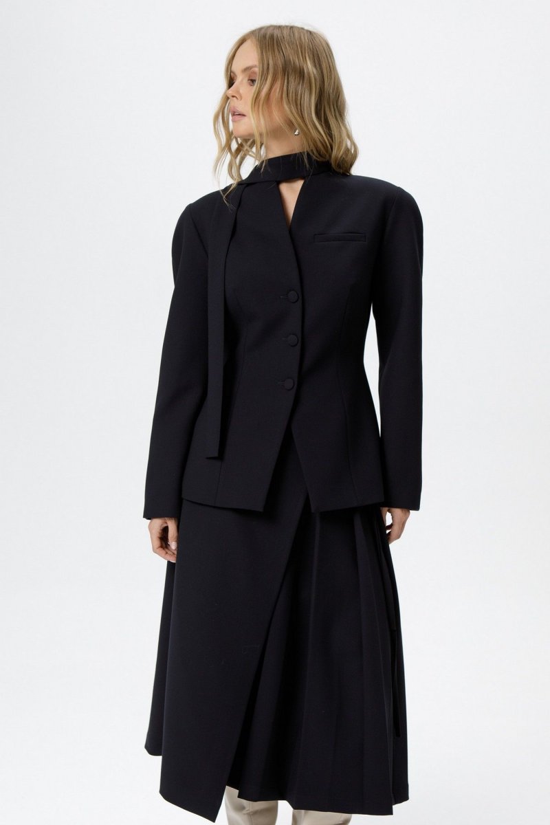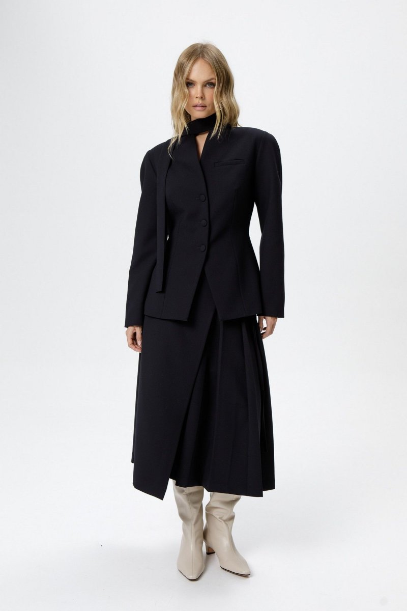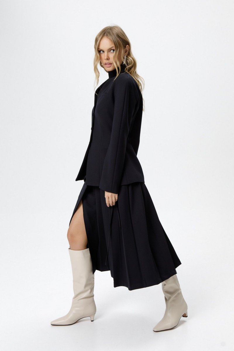 Костюм-двойка из приталенного жакета с акцентными плечами и асимметричной юбки со складками.