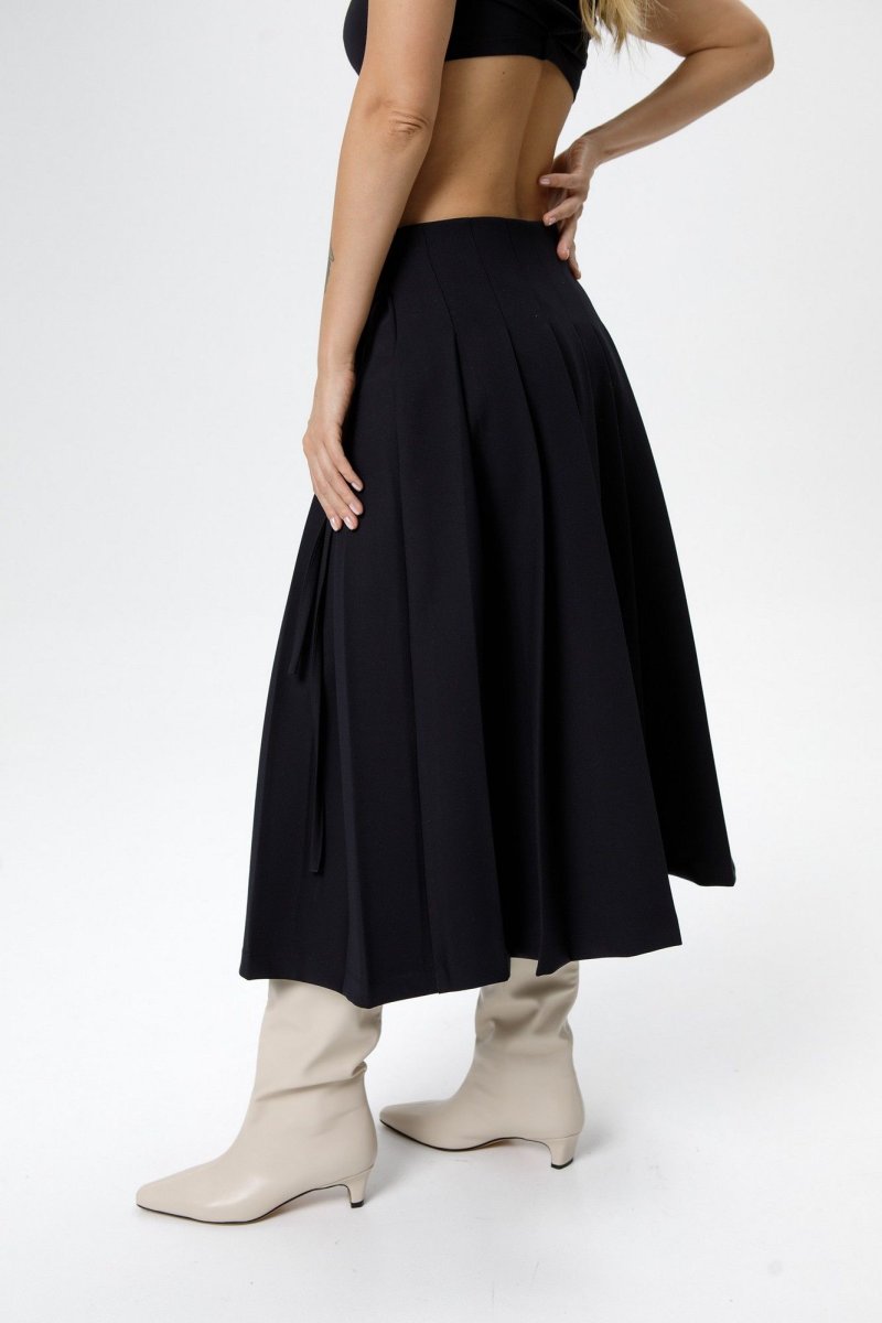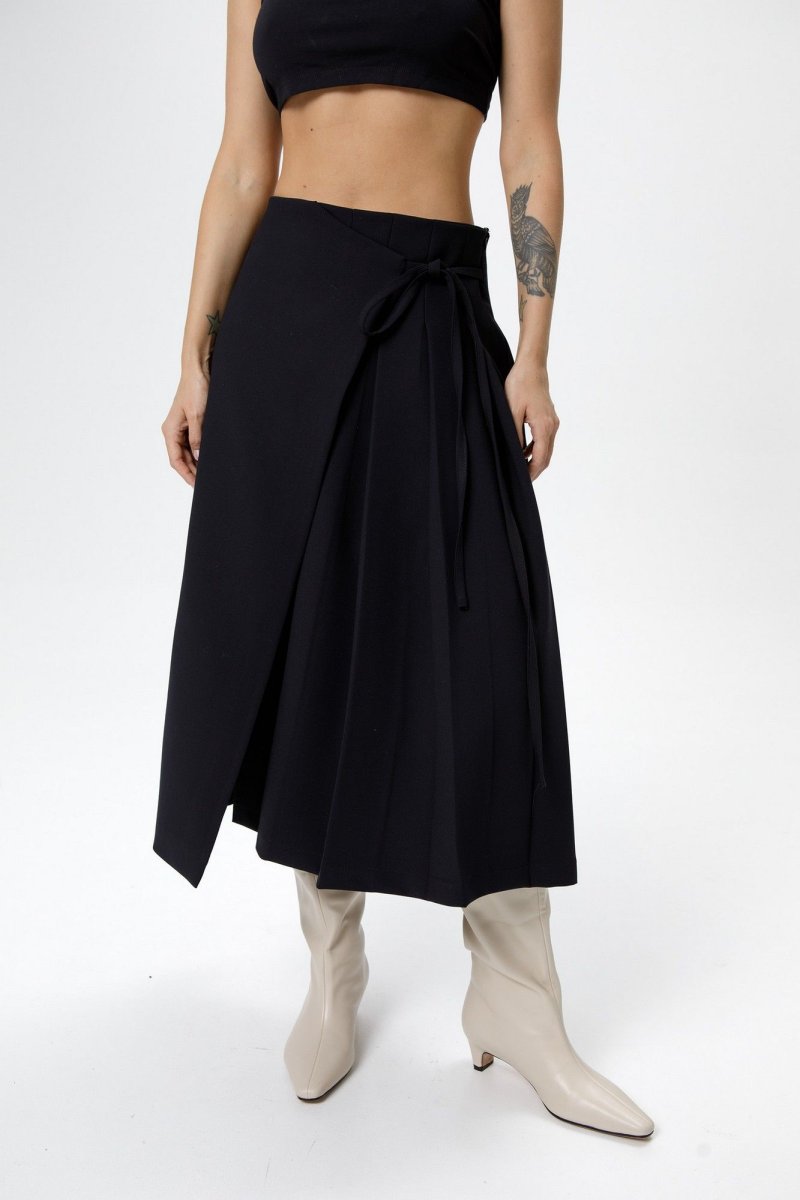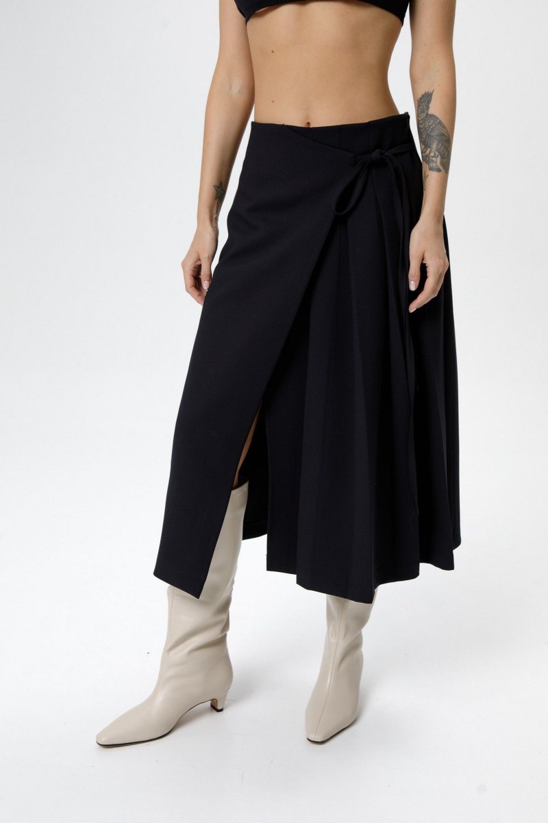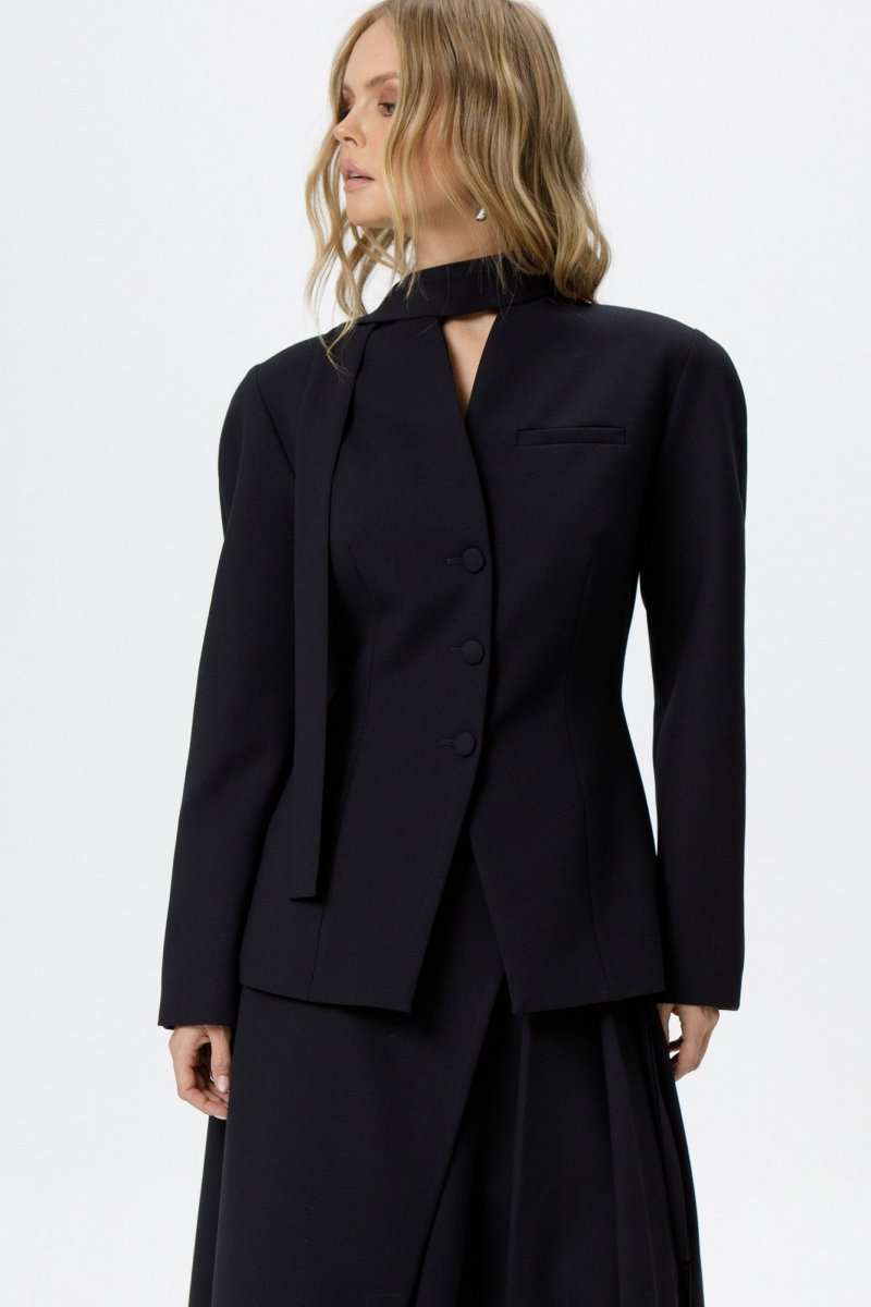 Костюм-двойка из приталенного жакета с акцентными плечами и асимметричной юбки со складками.