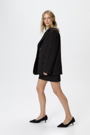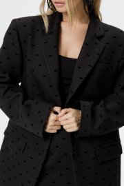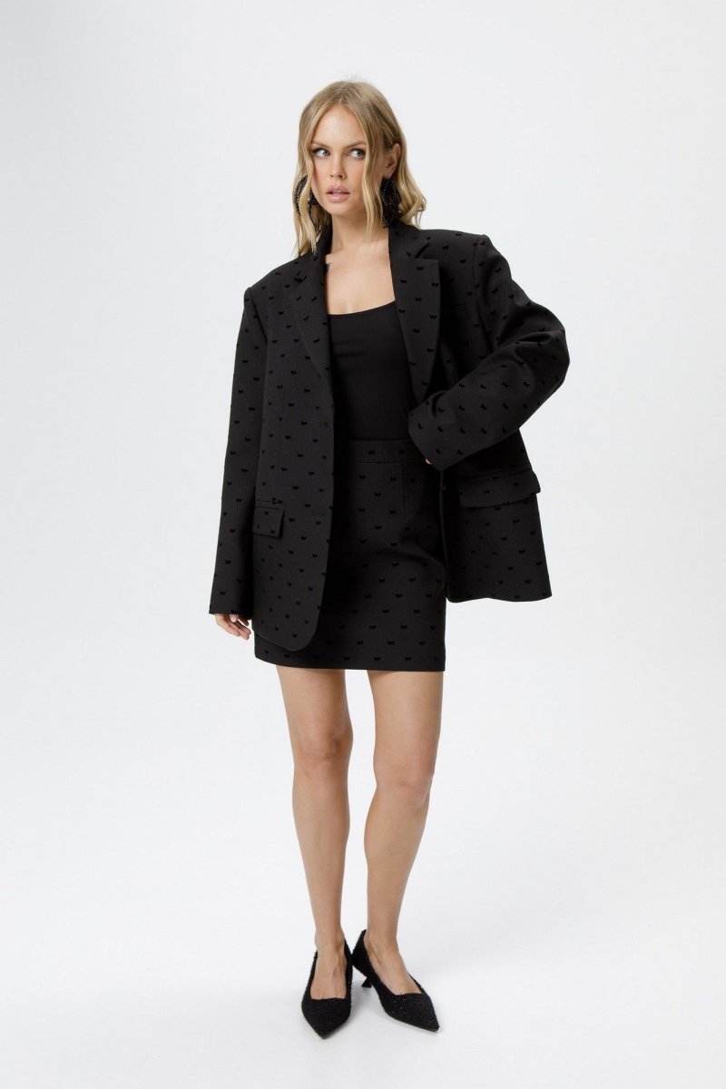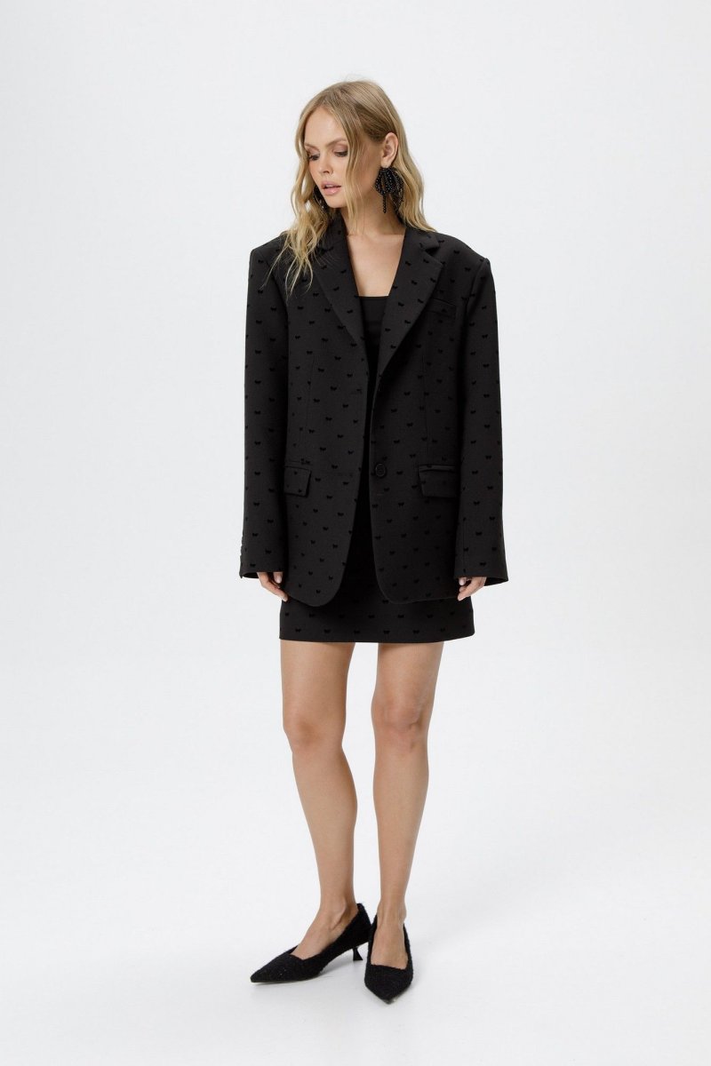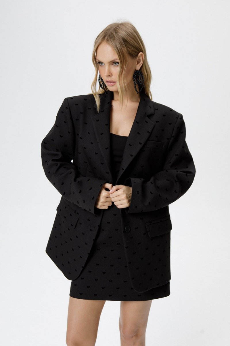 Костюм-двойка из оверсайз жакета и мини-юбки из костюмной ткани с бантиками из флока.